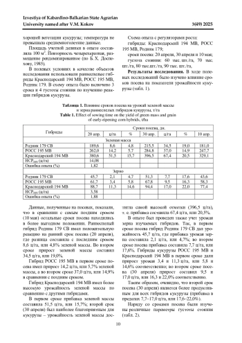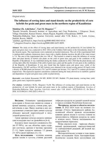 Исследование по влиянию сроков посева и густоты стояния на продуктивность гибридов кукурузы на зерно и зеленую массу проводилось в 2022-2024 годах на полевом стационаре «Учхоз» Зерендинского района Акмолинской области. Опыты закладывались на выщелоченном черноземе. Почва опытного поля - чернозем обыкновенный среднемощный, тяжелосуглинистый со слабощелочной реакцией; рН водной вытяжки равна 7,8. Площадь учетной делянки в опыте составляла 100 м2. Цель исследования - изучение влияния сроков посева и густоты стояния растений гибридов кукурузы на урожай зеленой массы и зерна в условиях Республики Казахстан. В ходе проведенного в 2022-2024 гг. исследования установлено, что густота стояния и сроки посева оказывают влияние на формирование урожая зеленой массы и качество зерна кукурузы. Также установлено, что наибольшая урожайность зерна и зеленой массы гибридов Краснодарский 194 МВ и РОСС 195 МВ получена во втором сроке посева (30 апреля) (с густотой 80 тыс. шт./га) (70,1 и 95 ц/га; 314,3 и 427,4 ц/га соответственно). Проведенные в ходе исследования расчеты уравнения регрессии позволили установить закономерность и зависимость урожая зерна и зеленой массы от густоты стояния растений.
