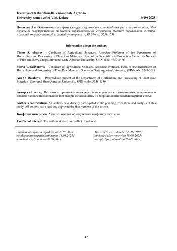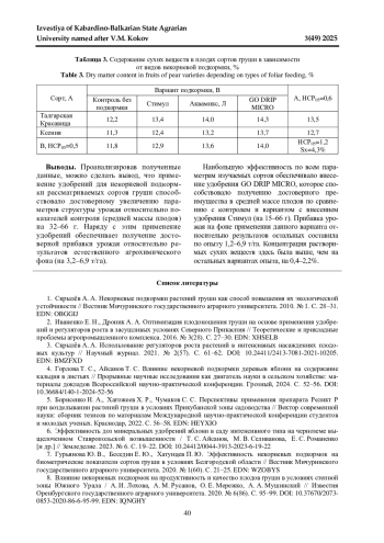В статье приведены результаты исследования, проведенного в 2023-2024 гг. на территории учебного сада Ставропольского государственного аграрного университета. Объектами исследования являлись осенние сорта груши Талгарская Красавица и Ксения. Предметом исследования были некорневые подкормки - удобрения, содержащие микроэлементы. Согласно разработанной схеме опыта изучалась эффективность фолиарного внесения удобрений Стимул (3 л/га), Аквамикс, Л (2 л/га) и GO DRIP MICRO (1 кг/га) в сравнении с контролем без удобрений. В рамках проводимого исследования анализировалось воздействие удобрений на среднюю массу плодов, урожайность и концентрацию растворимых сухих веществ в плодах изучаемых сортов груши. Согласно полученным результатам, удобрения обеспечивали достоверное преимущество по всем анализируемым показателям относительно контрольных вариантов. Сравнительная оценка изучаемых сортов груши показала, что наиболее высокая средняя масса плодов отмечалась у сорта Ксения (183 г), а наибольшие урожайность и концентрация сухих веществ были в плодах сорта Талгарская Красавица с достоверным превышением показателей второго сорта. Самые высокие показатели по всем анализируемым параметрам были получены на фоне применения удобрения GO DRIP MICRO. Преимущество данного варианта относительно остальных в средней массе плодов составило 15-66 г, в урожайности 1,2-6,9 т/га, концентрации растворимых сухих веществ 0,4-2,2%. При этом необходимо отметить, что по большинству рассматриваемых показателей удобрение Аквамикс, Л, несмотря на достоверное преимущество относительно вариантов контроля и удобрения Стимул, несущественно уступало лидирующему варианту.