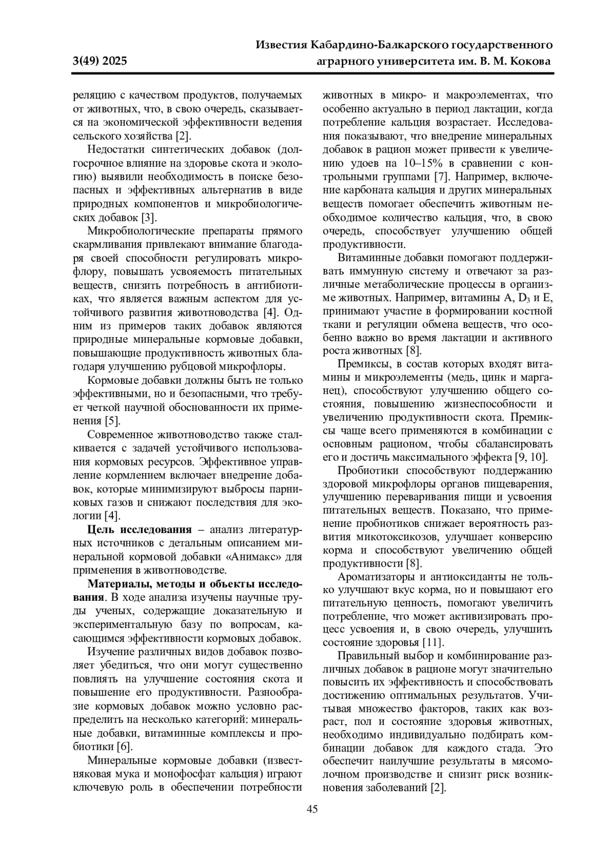 Проведен анализ применения кормовых добавок в рационе дойных коров за последние десятилетия. Отмечен значительный рост интереса к вопросам здоровья и благополучия сельскохозяйственных животных, что связано с увеличением требований к качеству продукции животноводства и необходимостью обеспечения устойчивого развития аграрного сектора. Однако несмотря на широкий ассортимент существующих добавок, проблема недостатка эффективных и безопасных решений остается актуальной, особенно в условиях современного животноводства. Одной из таких является минеральная кормовая добавка «Анимакс», которая была предметом исследования в Нижегородской области на коровах голштинской породы. Цель исследования - анализ литературных источников с детальным описанием минеральной кормовой добавки «Анимакс» для применения в животноводстве. В условиях интенсивного животноводства, где коровы подвержены различным стрессовым факторам, включая изменения в рационе, условия содержания и заболевания, использование безопасных и эффективных кормовых добавок становится особенно важным. В данной работе представлен обзор существующих кормовых добавок с учетом механизмов действия и влияния на здоровье животных (физиологические и гематологические показатели), а также на продуктивность скота. Установлено, что «Анимакс» может способствовать улучшению иммунной защиты, снижению заболеваемости и повышению продуктивности коров. Основное внимание уделено результатам исследования влияния «Анимакс»на физиологическое состояние коров, включая изменения в активности глутатиона, индексе интоксикации эритроцитов и количестве патогенных микроорганизмов, которые проанализированы в контексте их значения для здоровья коров и их продуктивности. Обсуждение результатов позволит выявить ключевые аспекты, которые подчеркивают важность использования «Анимакс» в современном животноводстве, а также его потенциал для улучшения здоровья и благополучия животных. В статье представлены перспективы для дальнейшего исследования и возможные направления применения минеральной кормовой добавки «Анимакс» в животноводстве.