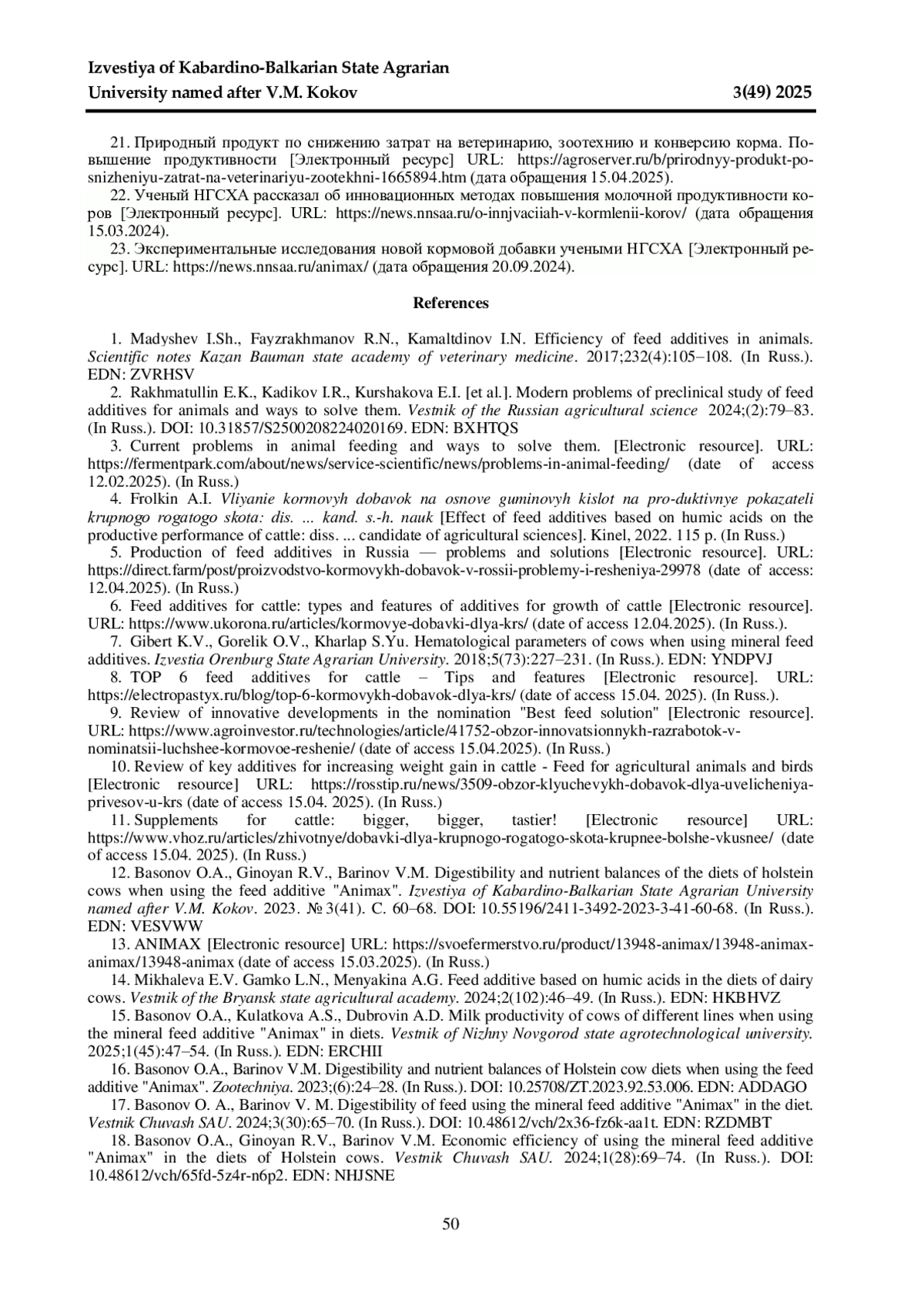 18. Басонов О. А., Гиноян Р. В., Баринов В. М. Экономическая эффективность применения минеральной кормовой добавки “Animax” в рационах коров голштинской породы // Вестник Чувашского государственного аграрного университета. 2024. № 1(28). С. 69-74. DOI: 10.48612/vch/65fd-5z4r-n6p2 EDN: NHJSNE