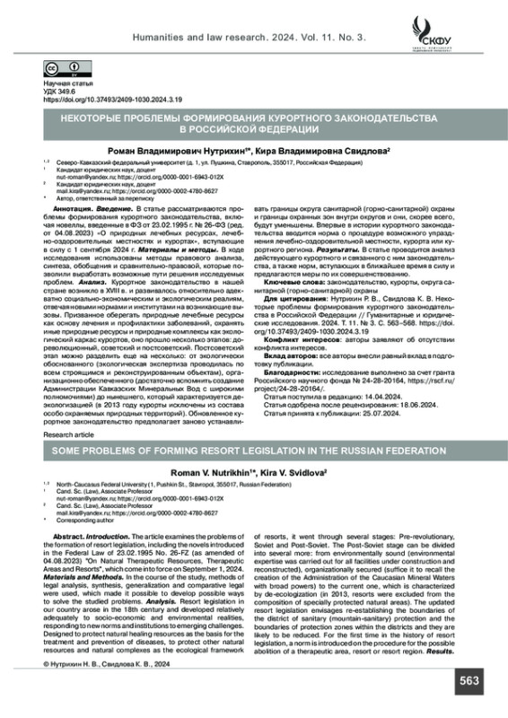 Введение. В статье рассматриваются проблемы формирования курортного законодательства, включая новеллы, введенные в ФЗ от 23.02.1995 г. № 26-ФЗ (ред. от 04.08.2023) «О природных лечебных ресурсах, лечебно-оздоровительных местностях и курортах», вступающие в силу с 1 сентября 2024 г.