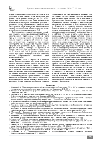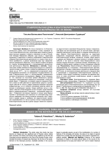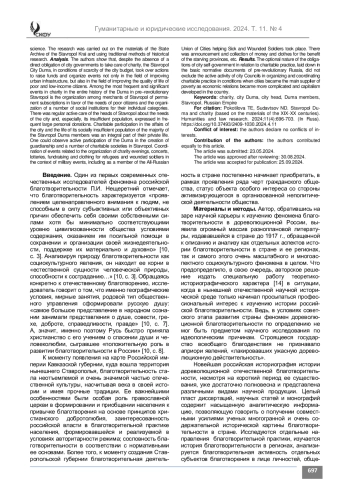 Анализ. Автор показывает, что, несмотря на отсутствие прямой обязанности органов городского самоуправления заниматься попечением о благотворении, Дума г. Ставрополя, в условиях скудости городского бюджета, взяла на себя действия по привлечению средств и организации событий не только в сфере совершенствования городской инфраструктуры, но и в области улучшения качества жизни неимущих и малоимущих горожан. Среди наиболее частых и значимых событий в благотворении за всю историю существования Думы в дореволюционном Ставрополе – организация среди купцов г. Ставрополя постоянных подписок в пользу нужд бедных горожан и организации для отдельных их категорий ряда социальных заведений; постоянное активное попечение глав Ставрополя о нуждах города и, особенно, его недостаточного населения, выражавшееся и в частых крупных личных пожертвованиях; благотворительное участие в делах города и жизни его социально недостаточного населения большинства гласных ставропольской Думы как неотъемлемая часть их частной жизни; заинтересованное деятельное участие Думы в создании попечительств и ряда обществ благотворительного характера на территории Ставрополя; координация событий, связанных с устройством благотворительных вечеров, концертов, лотерей, сбора средств и одежды для беженцев и раненых воинов в условиях военных событий, в том числе в качестве члена Всероссийского союза городов помощи больным и раненым воинам; объявление и руководство сбором денег и одежды в пользу голодающих губернии и др.