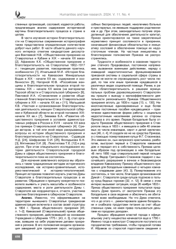Анализ. На конкретных исторических фактах показывается, как относительно позднее вхождение региона в состав Империи предопределило малочисленность потомственного дворянства на его территории, что именно активные события военной колонизации стали самым главным источником формирования местного дворянства: сюда стали переселяться дворяне из внутренних губерний России, царства Польского и западных губерний, и что мало кто из дворян Ставрополья имел земельные владения и основную статью их доходов составляла государственная служба. В ходе моделирования особенностей субъект – объектных отношений в благотворительном процессе на территории избранного региона учтены ограниченные возможности ставропольских дворян к крупным и частым благотворительным акциям и сравнительно небольшие, по отношению к внутренним губерниям России, масштабы базы потенциальных объектов благотворения.