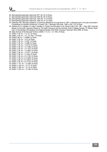 25. Шафранова О. И. Деятельность дамских обществ в благотворительности и просвещении во второй половине XIX - начале XX вв. (на примере Северокавказского региона) // Северный Кавказ и кочевой мир степной Евразии: VII «Минаевские чтения» по археологии, этнографии и краеведению Северного Кавказа. Ставрополь: СГУ, 2006.