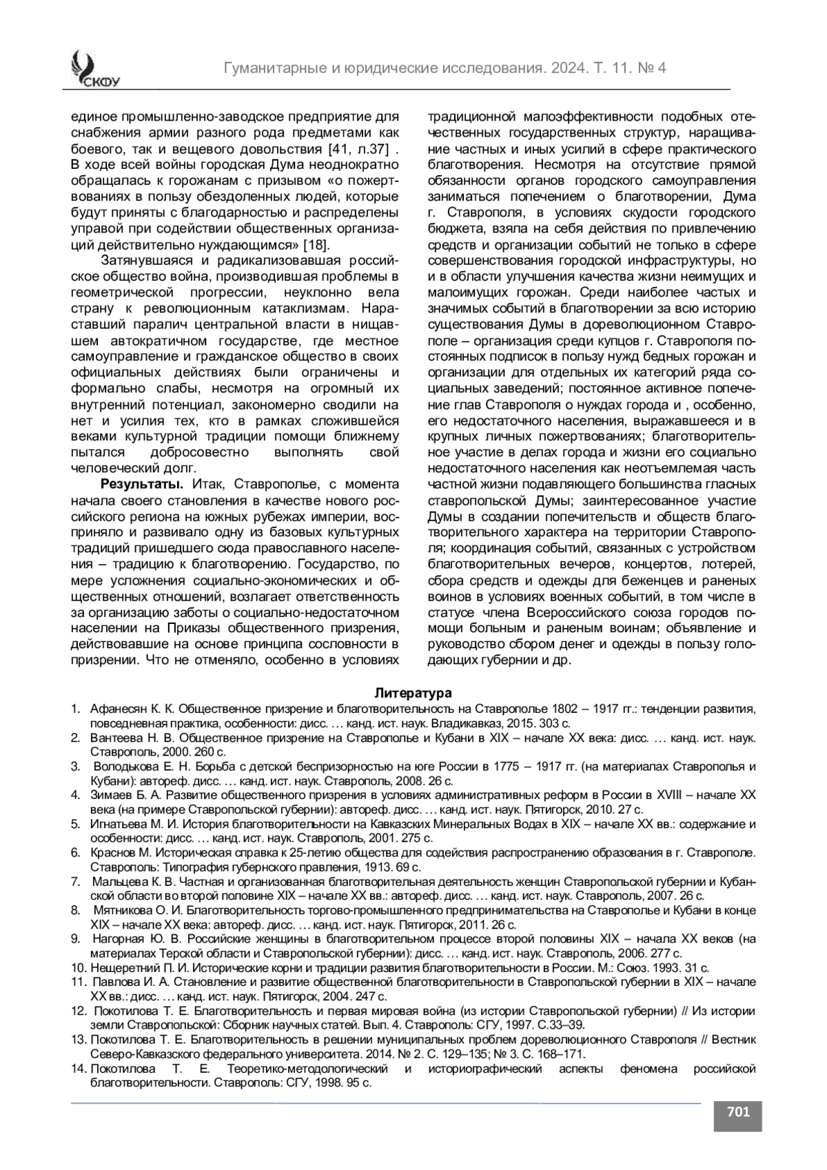 13. Покотилова Т. Е. Благотворительность в решении муниципальных проблем дореволюционного Ставрополя // Вестник Северо-Кавказского федерального университета. 2014. № 2. С. 129-135; № 3. С. 168-171.