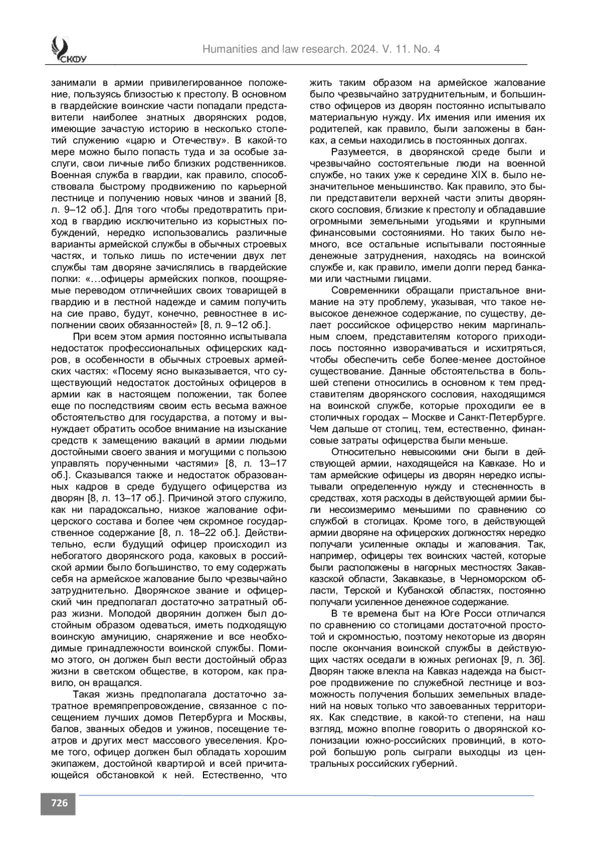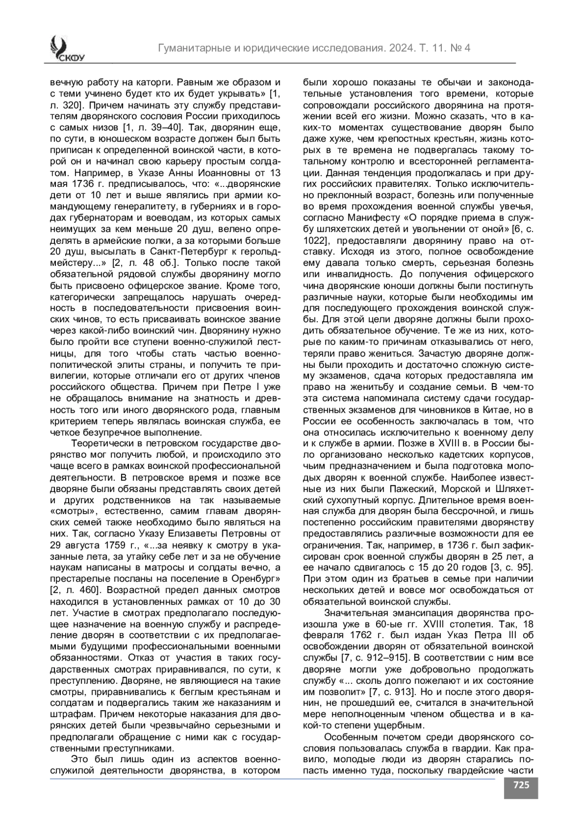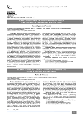 ЧИКАЕВА К. С. ВОЕННАЯ СЛУЖБА КАК СИСТЕМООБРАЗУЮЩИЙ ФАКТОР В ЖИЗНИ ДВОРЯНСТВА ИМПЕРАТОРСКОЙ РОССИИ // ГУМАНИТАРНЫЕ И ЮРИДИЧЕСКИЕ ИССЛЕДОВАНИЯ. 2024. ТОМ 11, № 4