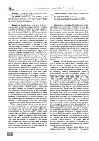 Результаты. По итогам исследования сделаны выводы о том, что первоначально российское государство, боролось с голодом бесконтрольно и архаично, не было создано централизованных органов, целью которых было обеспечение продовольственной безопасности, не существовало и правового урегулирования данных вопросов. Только начиная с правления Петра I ситуация постепенно начинает меняться, вводится распределительная система и контроль за торговлей в период неурожая. Екатерина II продолжает развивать организацию государственного управления в данной сфере. Выявляются постепенные изменения в системе государственного управления: появляются контрольно-надзорные органы и должностные лица, регулирующее вопросы продовольственной безопасности. В заключении статьи дается определение продовольственной безопасности на основе содержания деятельности государства в XVIII – XIX вв., данный период разбивается на этапы, дается их характеристика.