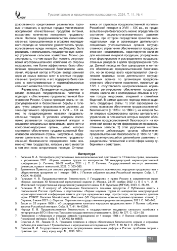 Анализ. Объектом исследования стала продовольственная безопасность России в период XVIII–XIX вв., предметом изучения является совокупность факторов, влияющих на обеспечение продовольственной безопасности в указанный период. В статье анализируются проблемы обеспечения продовольственной безопасности России в XVIII–XIX вв., оценивается эффективность мер по ее обеспечению.
