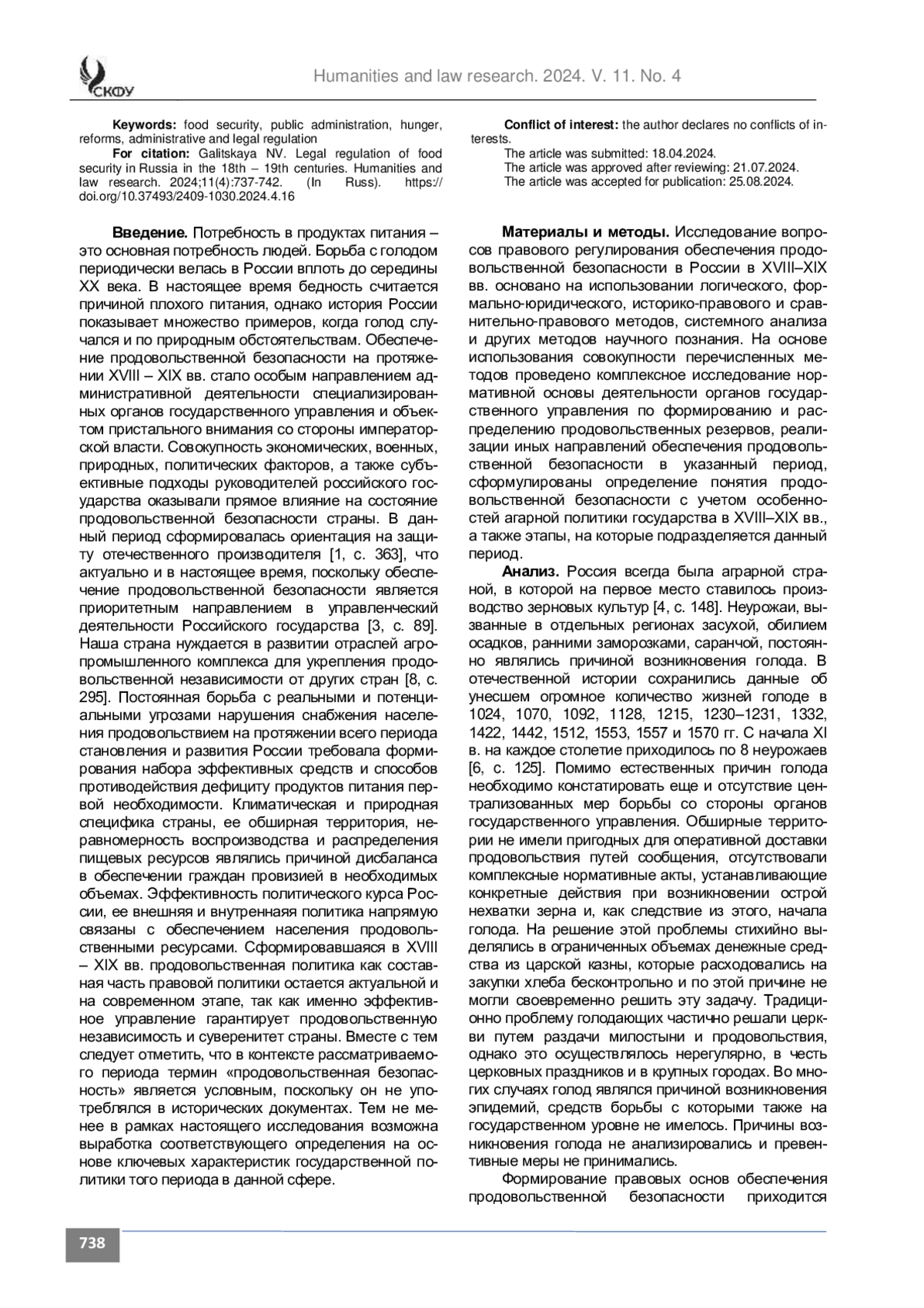 Введение. Вопросами обеспечения населения продовольствием руководители российского государства занимались с момента его становления. Осуществление правового и административного регулирования продовольственной безопасности проходило с переменным успехом. Тем не менее развитие агропромышленного комплекса и правового регулирования продовольственной безопасности заметно эволюционировало. Научная новизна статьи заключается в определении содержания продовольственной безопасности России и выявлении особенностей ее административного регулирования в период XVIII–XIX вв.