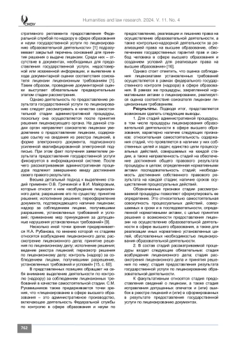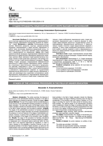 Введение. В статье рассматриваются особенности структуры административной процедуры лицензирования в сфере высшего образования посредством изучения ее элементов – стадий.