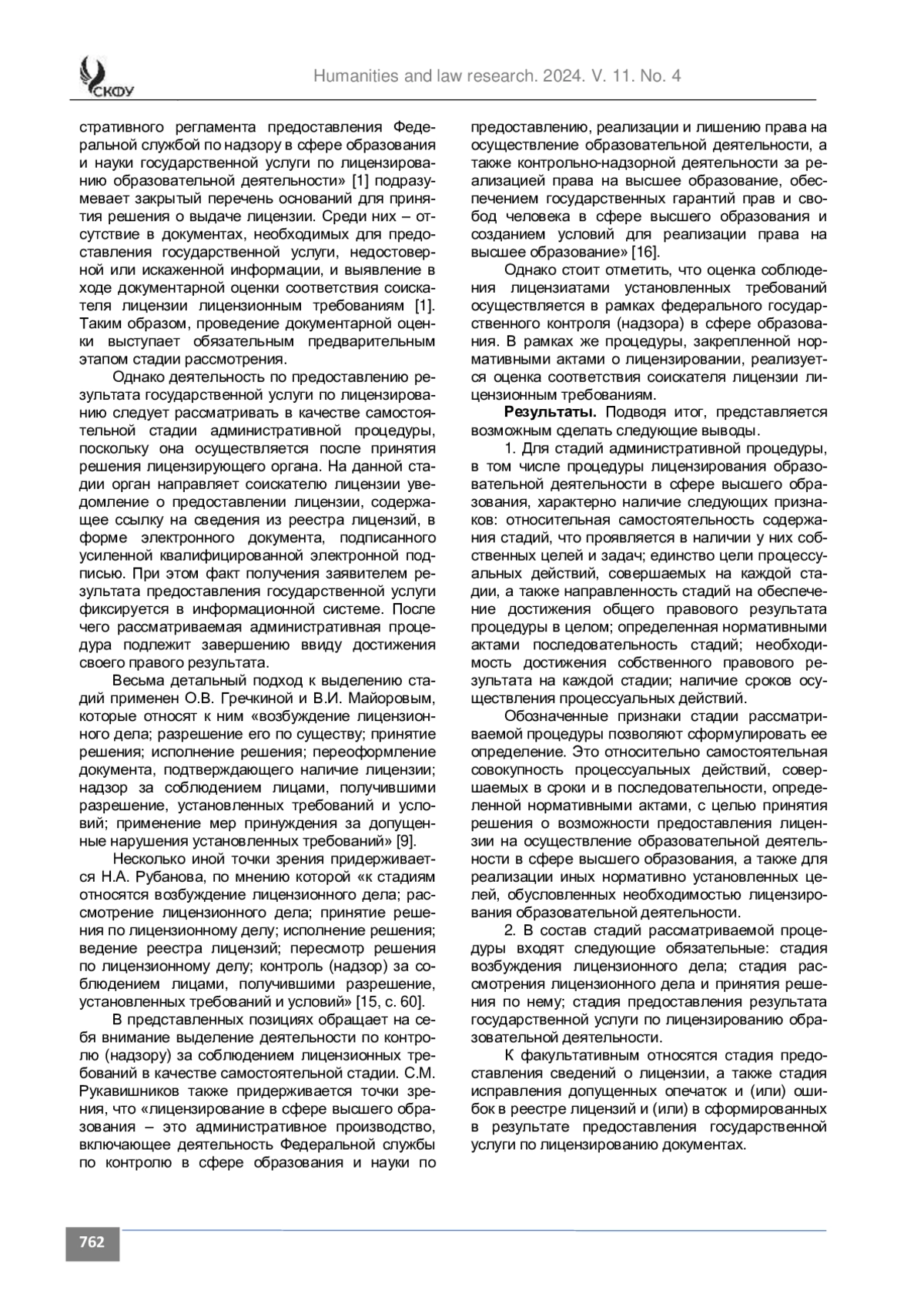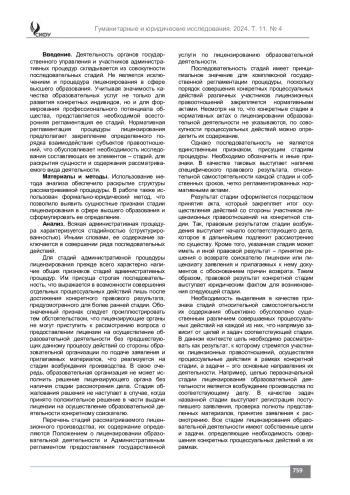 Материалы и методы. Использование метода анализа обеспечило раскрытие структуры административной процедуры лицензирования в сфере высшего образования. В работе также использован формально-юридический метод, что позволило выявить сущностные признаки стадии лицензирования и сформулировать ее определение.