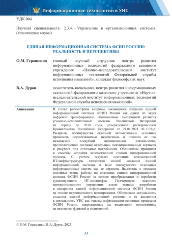 11. Чураков Д.Ю., Геращенко О.М. Состояние и перспективы развития единого информационного пространства уголовно-исполнительной системы Российской Федерации / В сб.: Вестник ФКУ НИИИТ ФСИН России. Тверь: ФКУ “Научно-исследовательский институт информационных технологий Федеральной службы исполнения наказаний”, 2023. Выпуск 6. С. 7-14. EDN: ATIFQI