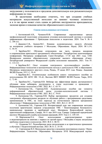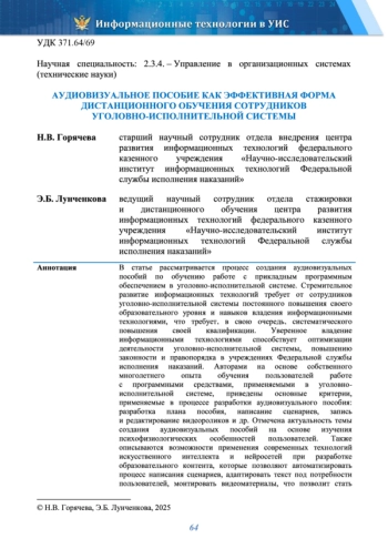 7. Лунченкова Э.Б., Горячева Н.В. Аудиовизуальные пособия как элементы информационной образовательной среды уголовно-исполнительной системы // Информационные технологии в УИС. 2021. № 2. С. 79-85. EDN: TBYXFD