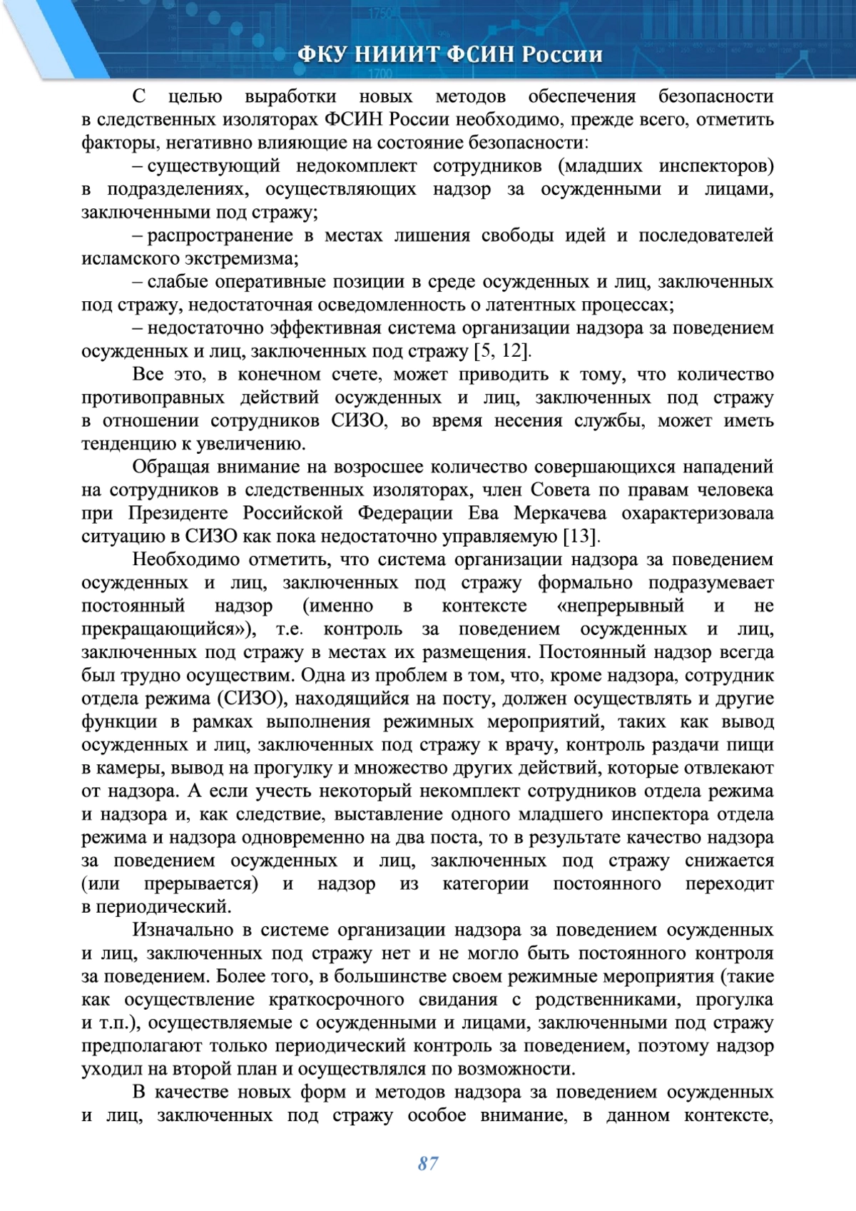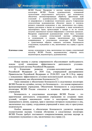 Новые вызовы и угрозы современности обусловливают необходимость поиска путей повышения эффективности деятельности уголовно- исполнительной системы Российской Федерации. системы В Концепции развития уголовно-исполнительной Российской Федерации до 2030 года, утвержденной распоряжением Правительства Российской Федерации от 29.04.2021 года No 1138-р, наряду с повышением эффективности уголовно-исполнительной системы, есть также такое направление, как обеспечение безопасности [7].