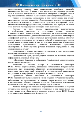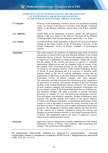В данной статье анализируются проблемы организации надзора за осужденными и лицами, заключенными под стражу, содержащимися в следственных изоляторах ФСИН России. Исследуются факторы, негативно влияющие на состояние надзора в учреждениях. Принимая во внимание, что качественный состав осужденных и лиц, заключенных под стражу, постоянно ухудшается, то, находясь под стражей, могут совершаться противоправные действия, при этом действующие системы видеоконтроля в полной мере не обеспечивают состояние безопасности в следственных изоляторах ФСИН России. Представляется перспективным и необходимым внедрение в организацию надзора в следственных изоляторах ФСИН России совместно с видеоаналитикой, аудиоаналитику, основанную на использовании систем искусственного интеллекта. Эта инновация будет способствовать повышению эффективности организации надзора за осужденными и лицами, заключенными под стражу в следственных изоляторах ФСИН России. Внедрение в систему надзора следственных изоляторов ФСИН России аудиоаналитики, оснащенной технологиями искусственного интеллекта, даст возможность обеспечить автоматизированную обработку фактически всей голосовой и аудиовизуальной информации, поступающей от микрофонных и телефонных технических средств. Современная технологичная аудиоаналитика обеспечит анализ и контроль речевого поведения осужденных и лиц, заключенных под стражу, перевод разговоров и анализ их содержания, а также возможность анализировать звуки, происходящие в камере и на их основе получать максимально полную информацию о латентных процессах. Внедрение современной аудиоаналитики может быть положено в основу создания отечественной системы кибернадзора за осужденными и лицами, заключенными под стражу, содержащимися в следственных изоляторах ФСИН России и существенным образом повысить состояние безопасности сотрудников, осужденных и лиц, заключенных под стражу и других граждан.