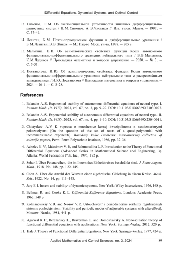 1. Баландин, А. С. Экспоненциальная устойчивость автономных дифференциальных уравнений нейтрального типа. I / А. С. Баландин // Изв. вузов. Матем. - 2023. - № 3. - С. 12-28. EDN: USYUZO