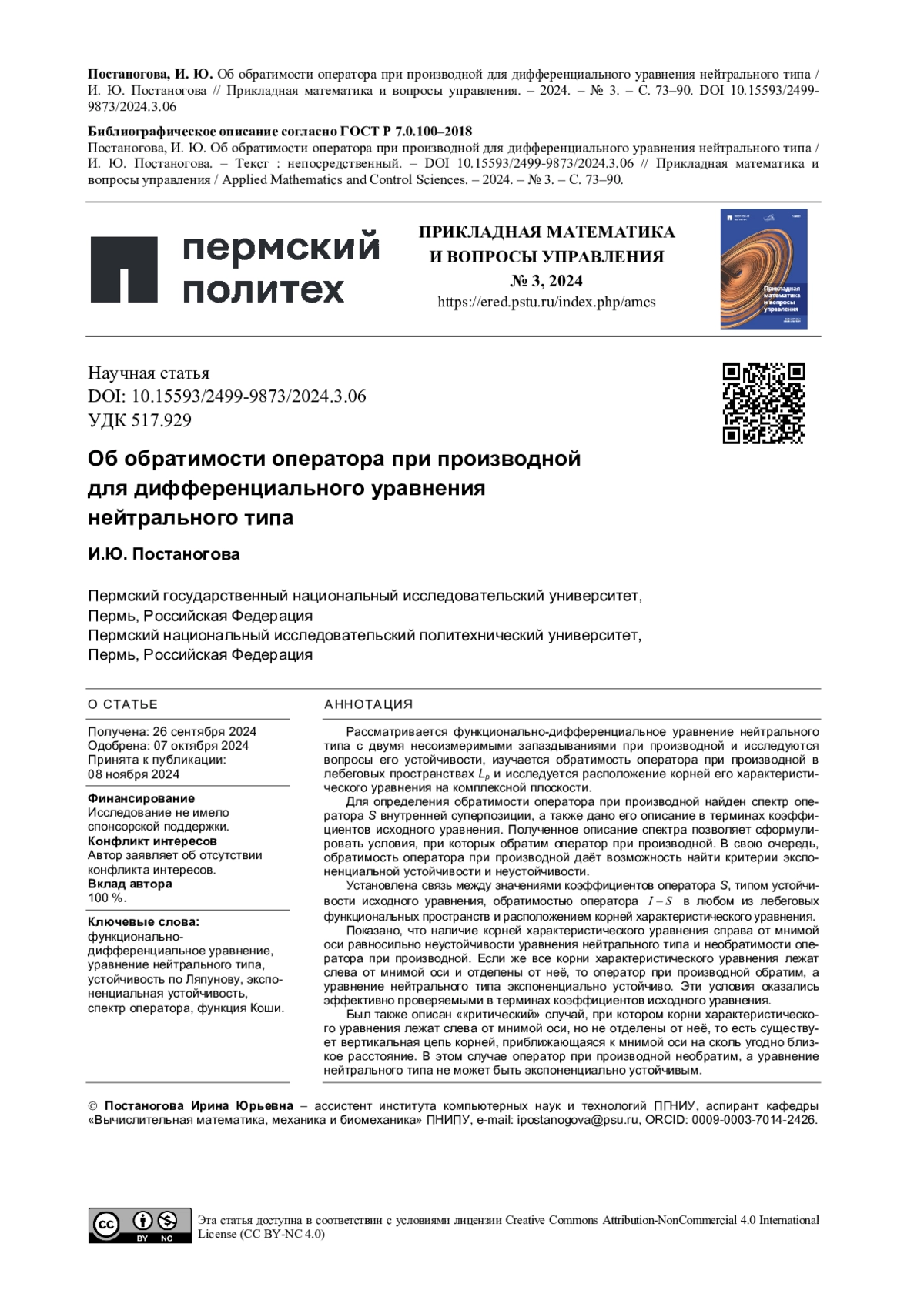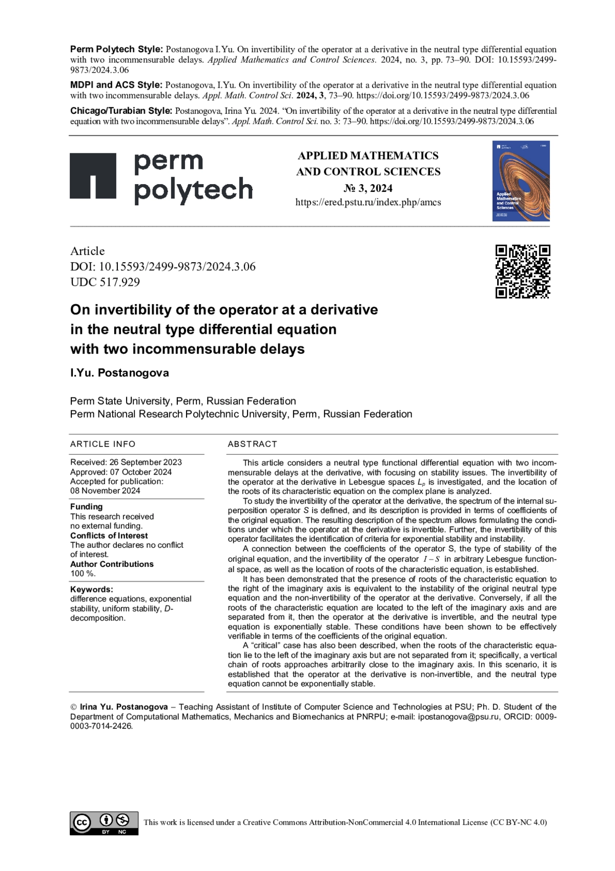 16. Постаногова, И. Ю. Об асимптотических свойствах функции Коши автономного функционально-дифференциального уравнения нейтрального типа с распределённым запаздыванием / И. Ю. Постаногова // Прикладная математика и вопросы управления. - 2024. - № 1. - С. 8-28. EDN: DNTPIC