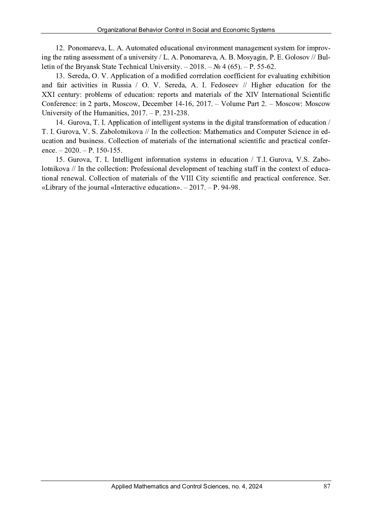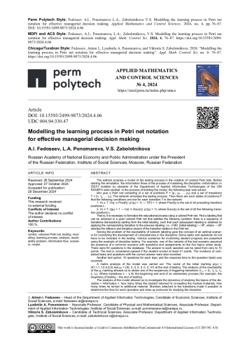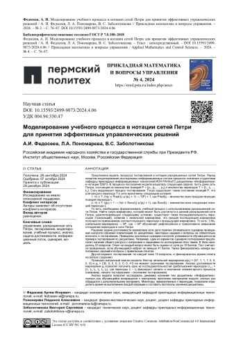 ФЕДОСЕЕВ А. И., ПОНОМАРЕВА Л. А., ЗАБОЛОТНИКОВА В. С. МОДЕЛИРОВАНИЕ УЧЕБНОГО ПРОЦЕССА В НОТАЦИИ СЕТЕЙ ПЕТРИ ДЛЯ ПРИНЯТИЯ ЭФФЕКТИВНЫХ УПРАВЛЕНЧЕСКИХ РЕШЕНИЙ // ПРИКЛАДНАЯ МАТЕМАТИКА И ВОПРОСЫ УПРАВЛЕНИЯ. 2024. № 4