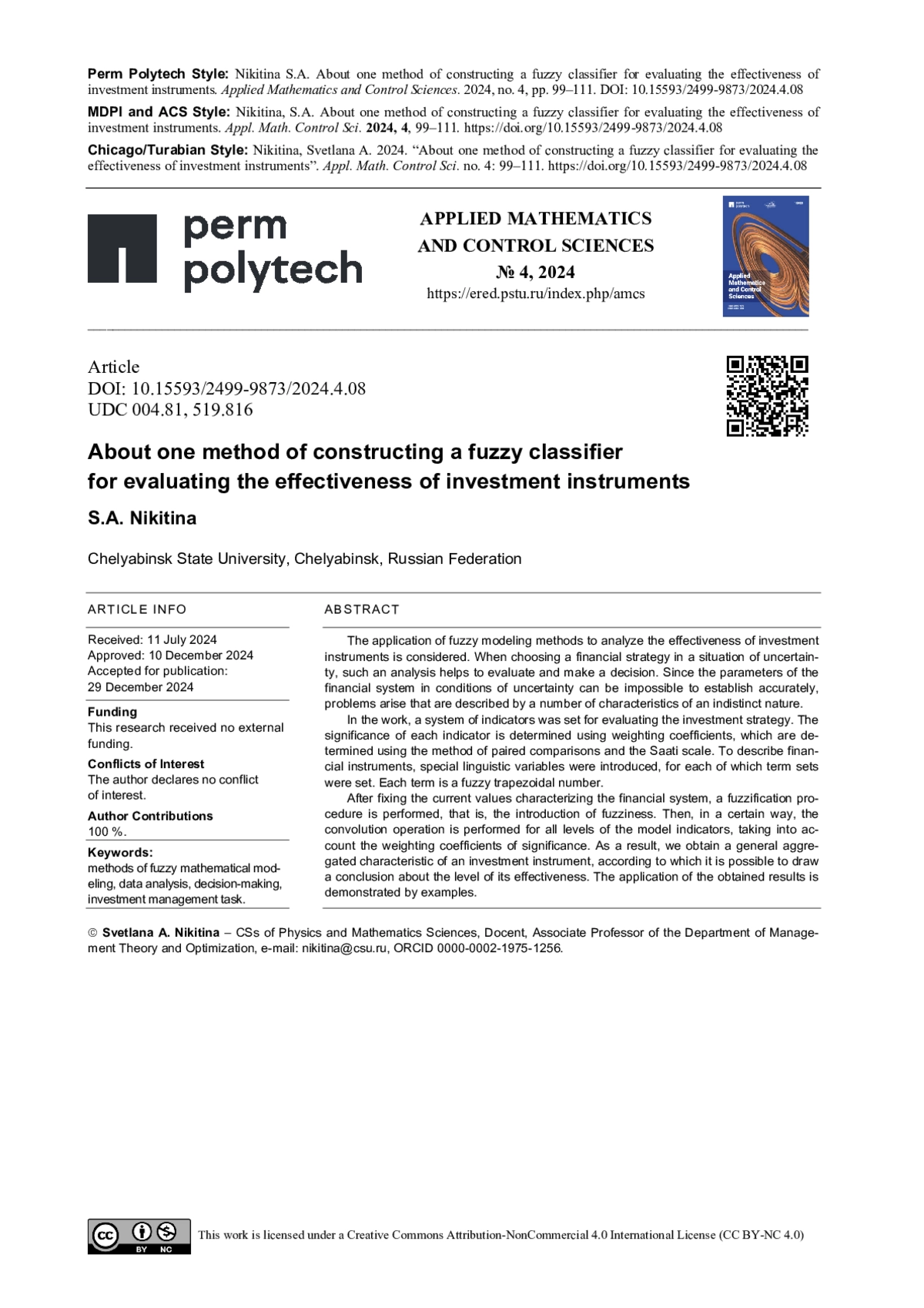 1. Zhou, W. Review of fuzzy investment research considering modelling environment and element fusion / W. Zhou, D. Luo, Z. Xu // International Journal of Systems Science. - 2022. - № 53(9). - P. 1958-1982. DOI: 10.1080/00207721.2022.2031340 EDN: GTQGSX