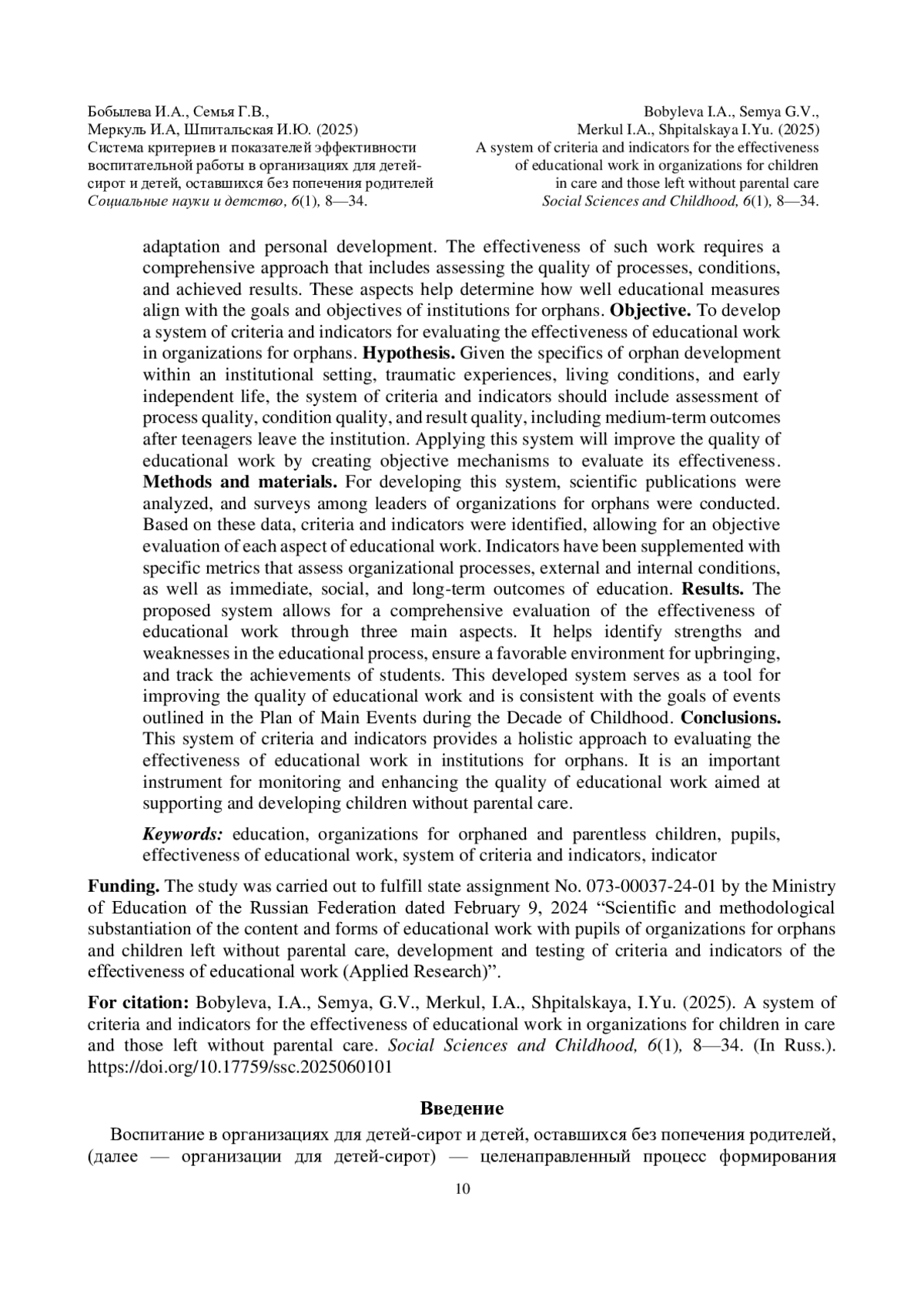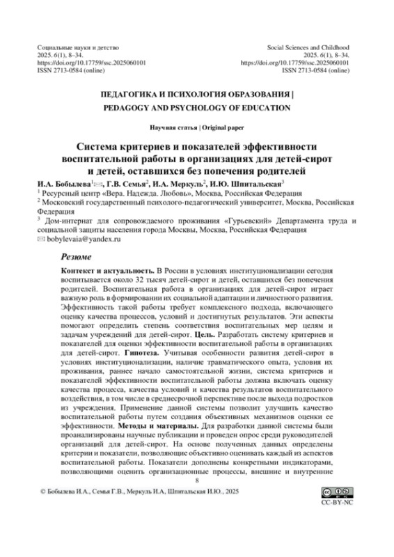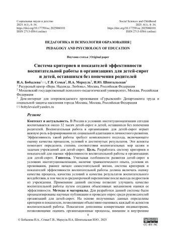 Bobyleva, I.A., Semya, G.V. (2024). The specifics of educational work in organizations for orphaned children and children left without parental care. Social Sciences and Childhood, 5(3), 40-53. (In Russ.). DOI: 10.17759/ssc.2024050303