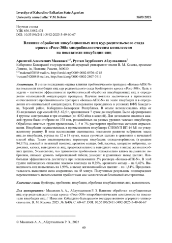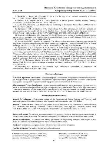 2. Абдулхаликов Р. З. Повышение продуктивных и воспроизводительных качеств кур мясных кроссов и бройлеров: дис. … д-ра с.-х. наук. Москва, 2022. 271 с. EDN: EMCJCW