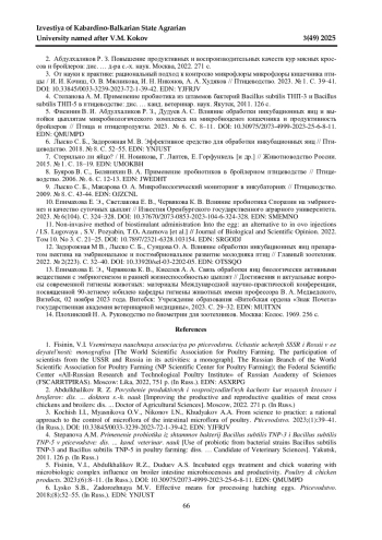 5. Фисинин В. И. Абдулхаликов Р. З., Дудуев А. С. Влияние обработки инкубационных яиц и выпойки цыплятам микробиологического комплекса на микробиоценоз кишечника и продуктивность бройлеров // Птица и птицепродукты. 2023. № 6. С. 8-11. DOI: 10.30975/2073-4999-2023-25-6-8-11 EDN: QMUMPD