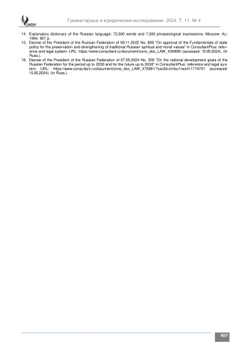 15. Указ Президента Российской Федерации от 09.11.2022 г. № 809 «Об утверждении Основ государственной политики по сохранению и укреплению традиционных российских духовно-нравственных ценностей» // КонсультантПлюс: справочно-правовая система: [сайт]. URL: https://www.consultant.ru/document/cons_doc_LAW_430906. (дата обращения: 15.05.2024)