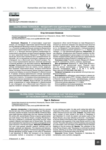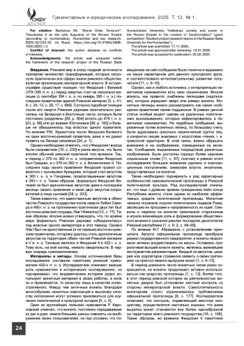 Введение. В историографии существует мнение, что последним правителем единой Римской империи был Феодосий I Великий и после его смерти в начале 395 г. н. э. Римское государство больше никогда не объединялось под властью одного правителя. Однако известно, что в течение V в. н. э. несколько восточно-римских императоров получали власть над обоими частями Римской державы. Одним из таких правителей являлся Феодосий II. Подобное положение дел нашло свое отражение как в нумизматических памятниках, так и в письменных источниках, созданных как как в Западной, так и в Восточной части Римской империи. Также в статье подчеркивается важность монетной пропаганды в Римской державы и ее массовый характер.