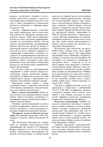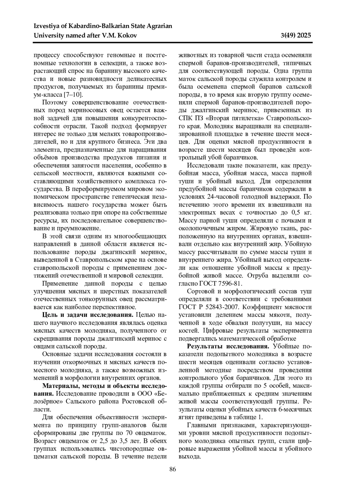 ЗАСЕМЧУК И. В., КОЛОСОВА Н. Н. МЯСНАЯ ПРОДУКТИВНОСТЬ ПОМЕСНЫХ МЕРИНОСОВЫХ ОВЕЦ // ИЗВЕСТИЯ КАБАРДИНО-БАЛКАРСКОГО ГОСУДАРСТВЕННОГО АГРАРНОГО УНИВЕРСИТЕТА ИМ. В. М. КОКОВА. 2025. № 3 (49)