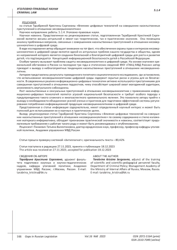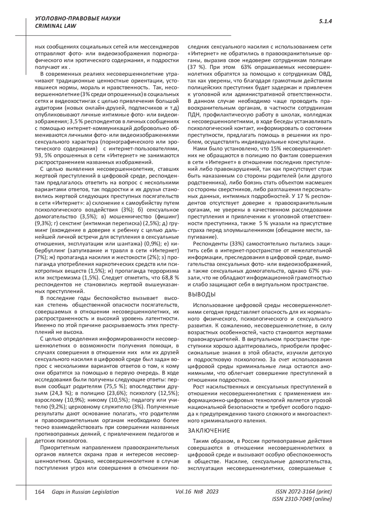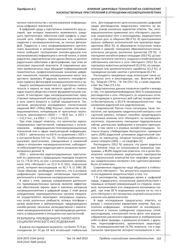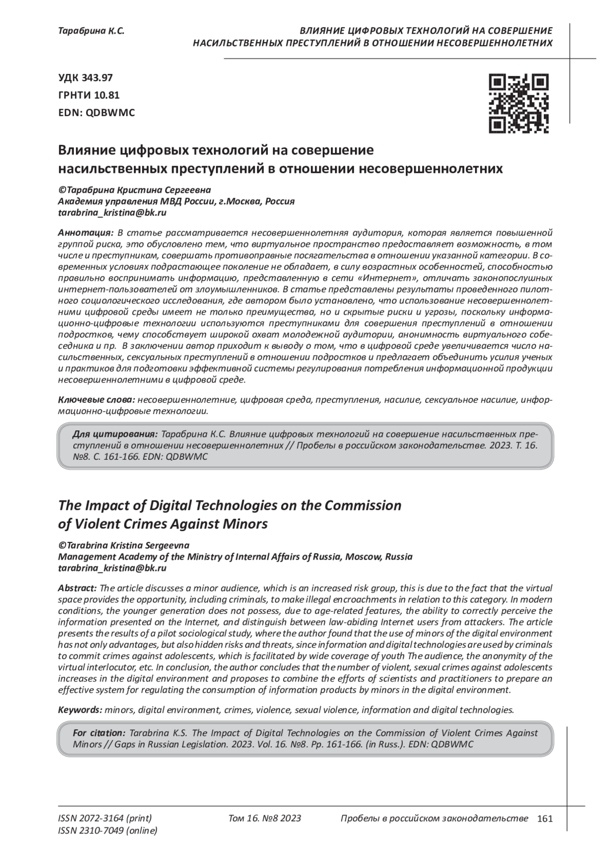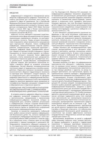 Статья: ВЛИЯНИЕ ЦИФРОВЫХ ТЕХНОЛОГИЙ НА СОВЕРШЕНИЕ НАСИЛЬСТВЕННЫХ ПРЕСТУПЛЕНИЙ В ОТНОШЕНИИ НЕСОВЕРШЕННОЛЕТНИХ (2023)
