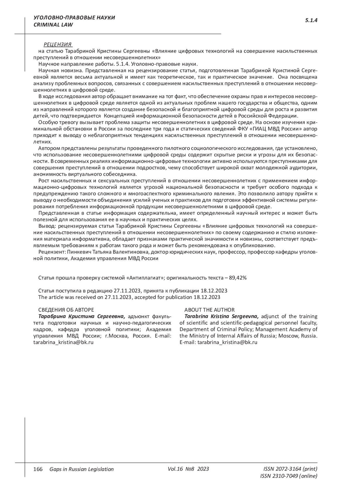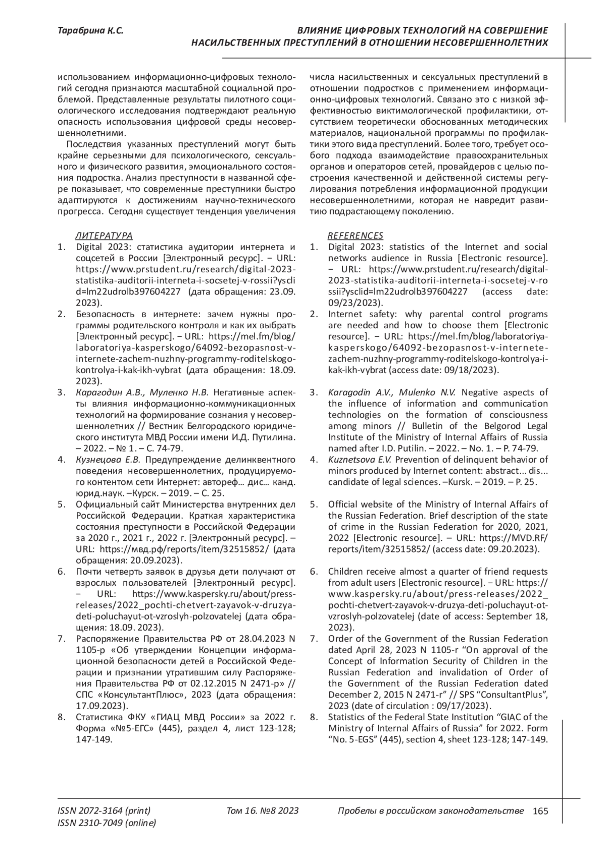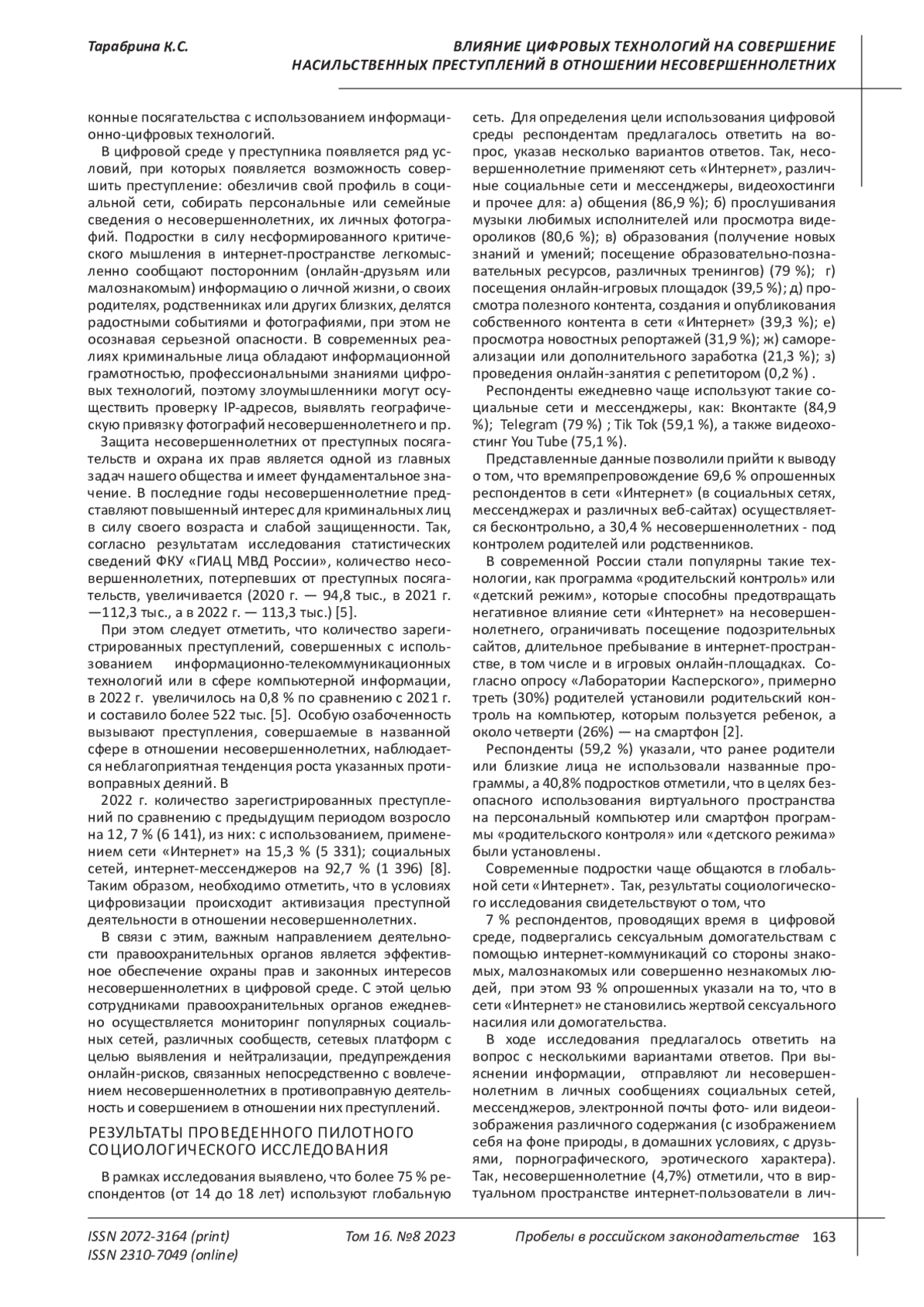 ТАРАБРИНА К. ВЛИЯНИЕ ЦИФРОВЫХ ТЕХНОЛОГИЙ НА СОВЕРШЕНИЕ НАСИЛЬСТВЕННЫХ ПРЕСТУПЛЕНИЙ В ОТНОШЕНИИ НЕСОВЕРШЕННОЛЕТНИХ // ПРОБЕЛЫ В РОССИЙСКОМ ЗАКОНОДАТЕЛЬСТВЕ. 2023. Т. 16 № 8 (36 СТ.)