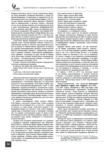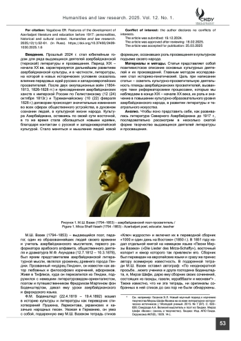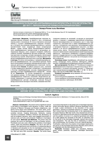ВАГАБОВА Э. Р. ОСОБЕННОСТИ РАЗВИТИЯ АЗЕРБАЙДЖАНСКОЙ ЛИТЕРАТУРЫ И ПРОСВЕТИТЕЛЬСТВА ДО 1917 Г.: ПЕРСОНАЛИИ И ИСТОРИКО-КУЛЬТУРНЫЙ КОНТЕКСТ // ГУМАНИТАРНЫЕ И ЮРИДИЧЕСКИЕ ИССЛЕДОВАНИЯ. 2025. ТОМ 12, № 1