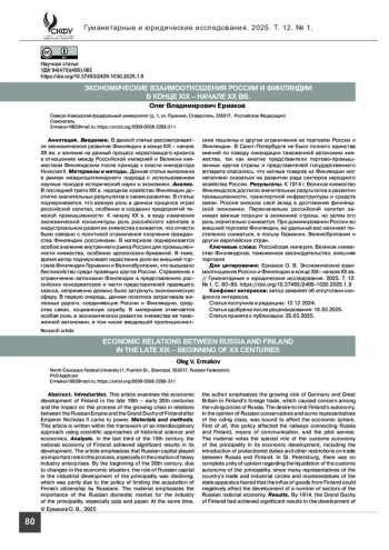 Анализ. В последней трети XIX в. народное хозяйство Финляндии достигло значительных результатов в своем развитии. В статье подчеркивается, что важную роль в данном процессе играл российский капитал, особенно в создании предприятий тяжелой промышленности. К началу ХХ в. в виду изменения экономической конъюнктуры роль российского капитала в индустриальном развитии княжества снижается, что отчасти было связано с политикой ограничения получения гражданства Финляндии россиянами. В материале подчеркивается особое значение внутреннего рынка России для промышленности княжества, особенно целлюлозно-бумажной. В тоже, время автор подчеркивает нарастание роли во внешней торговле Финляндии Германии и Великобритании, что вызывало беспокойство среди правящих кругов России. Стремление к ограничению автономии Финляндии в представлениях российских консерваторов и части представителей правящего класса, непременно должно было затронуть экономическую сферу. В первую очередь, данная политика затрагивала железные дороги, соединяющие России и Финляндию, средства связи, лоцманскую службу. В материале отмечается особая роль в экономическом развитии княжества ее таможенной автономии, в том числе вводившей протекционистские пошлины и другие ограничения на торговлю России и Финляндии. В Санкт-Петербурге не было полного единства мнений по поводу ликвидации таможенной автономии княжества, так как многие представители торгово-промышленных кругов страны и представителей государственного аппарата опасались, что наплыв товаров из Финляндии мог негативно сказаться на развитии ряда секторов народного хозяйства России.