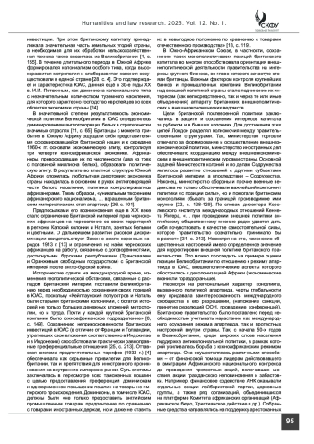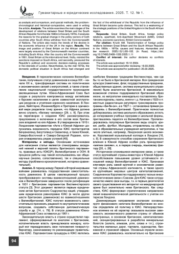 Введение. В глобальном масштабе для европейских метрополий африканский континент имел исключительную ценность с экономической и политической точек зрения. Для Великобритании особую привлекательность традиционно представлял южно-африканский регион, который обеспечивал британскому капиталу монопольные рынки сбыта, основные источники сырья для развития стратегических производств и наиболее выгодные направления для инвестиций. Стремление Великобритании усилить как экономическое, так и военно-политическое присутствие в традиционных зонах влияния на всем континенте и, прежде всего, в наиболее промышленно развитом Южно-Африканском Союзе, определяло направленность ее внешнеполитической стратегии и способствовало установлению прочных двусторонних отношений между странами. При этом на протяжении длительного времени они развивались в контексте исторически сложившегося подхода, когда основные аспекты политической и экономической деятельности ЮАС формировались с учетом интересов метрополии. На характер внешнеполитических взаимоотношений значительное влияние оказала как система апартеида, получившая развитие в ЮАС с 1948 года, так и система расовой дискриминации в целом, возникшая в Южной Африке еще в XVII веке.