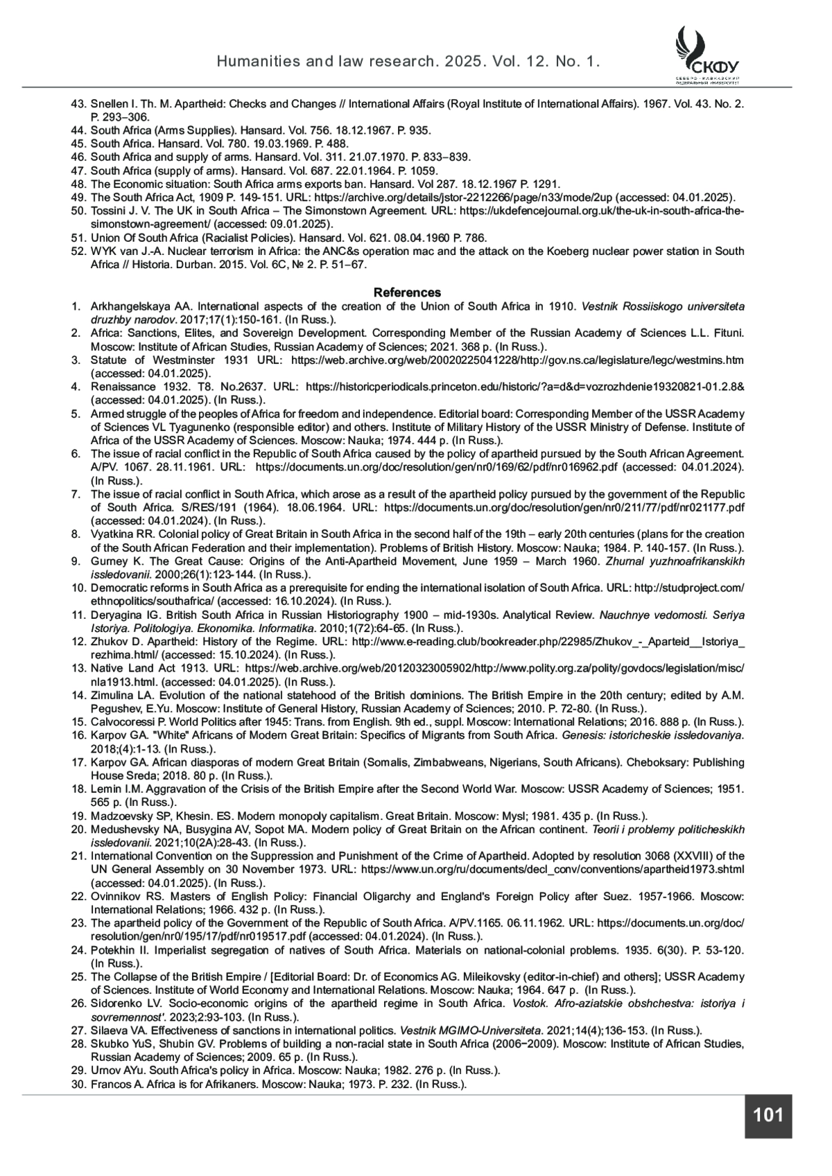 1. Архангельская А. А. Международные аспекты создания Южно-Африканского Союза в 1910 г. // Вестник Российского университета дружбы народов. Серия: Международные отношения. 2017. Т. 17. № 1. С. 150-161.
