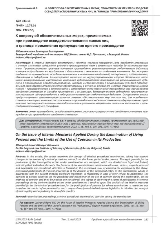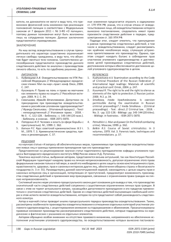 1. Кудрявцева А.В. Освидетельствование по УПК Российской Федерации // Международные юридические чтения: Мат-лы науч.-практ. конф. Омск, 2004. С. 247. EDN: SIWWHR
