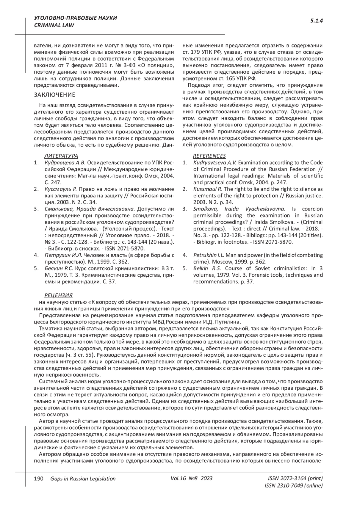 Smolkova, Iraida Vyacheslavovna. Is coercion permissible during the examination in Russian criminal proceedings? / Iraida Smolkova. - (Criminal proceedings). - Text: direct // Criminal law. - 2018. - No. 3. - pp. 122-128. - Bibliogr.: pp. 143-144 (20 titles). - Bibliogr. in footnotes. - ISSN 2071-5870.