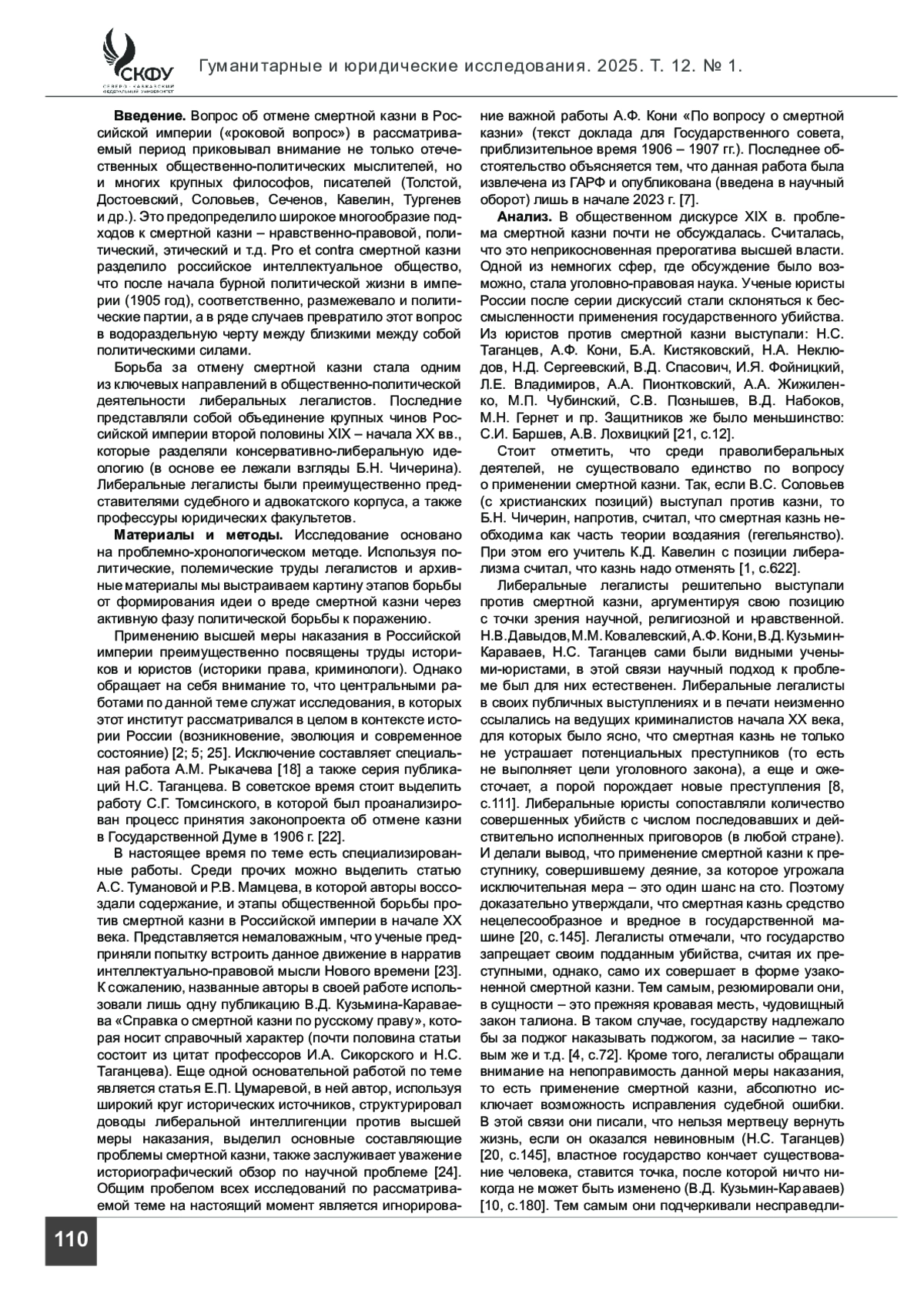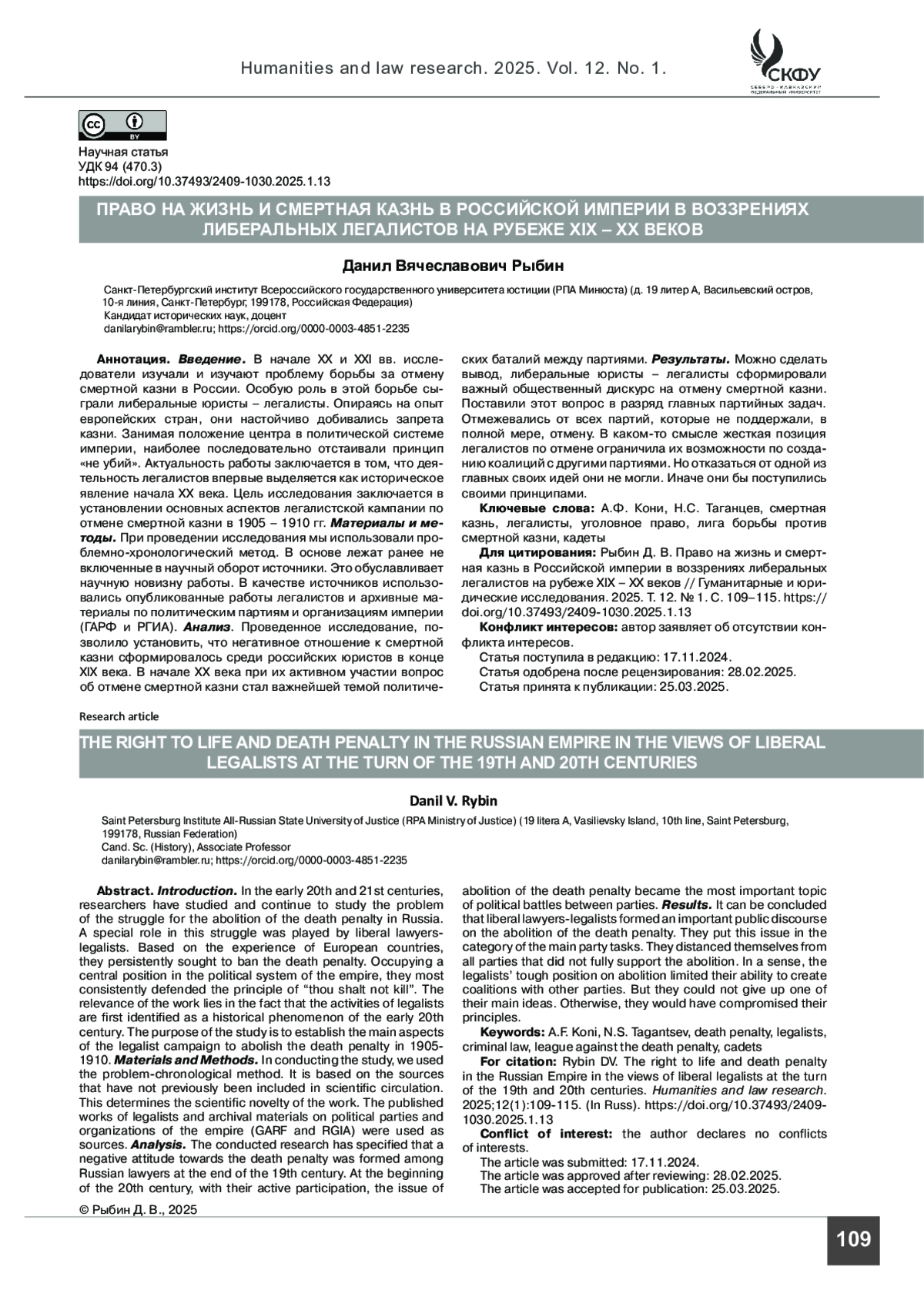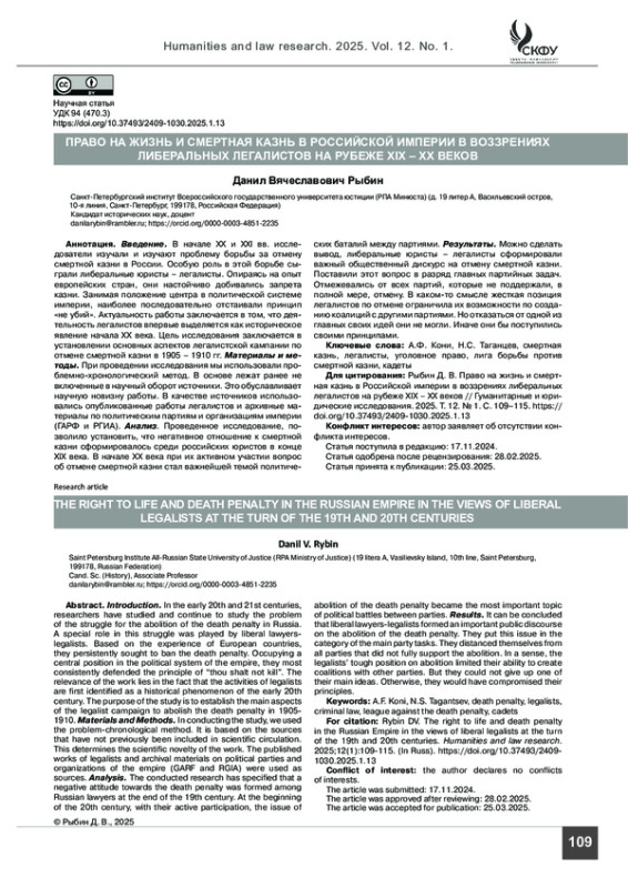 РЫБИН Д. В. ПРАВО НА ЖИЗНЬ И СМЕРТНАЯ КАЗНЬ В РОССИЙСКОЙ ИМПЕРИИ В ВОЗЗРЕНИЯХ ЛИБЕРАЛЬНЫХ ЛЕГАЛИСТОВ НА РУБЕЖЕ ХIХ – ХХ ВЕКОВ // ГУМАНИТАРНЫЕ И ЮРИДИЧЕСКИЕ ИССЛЕДОВАНИЯ. 2025. ТОМ 12, № 1