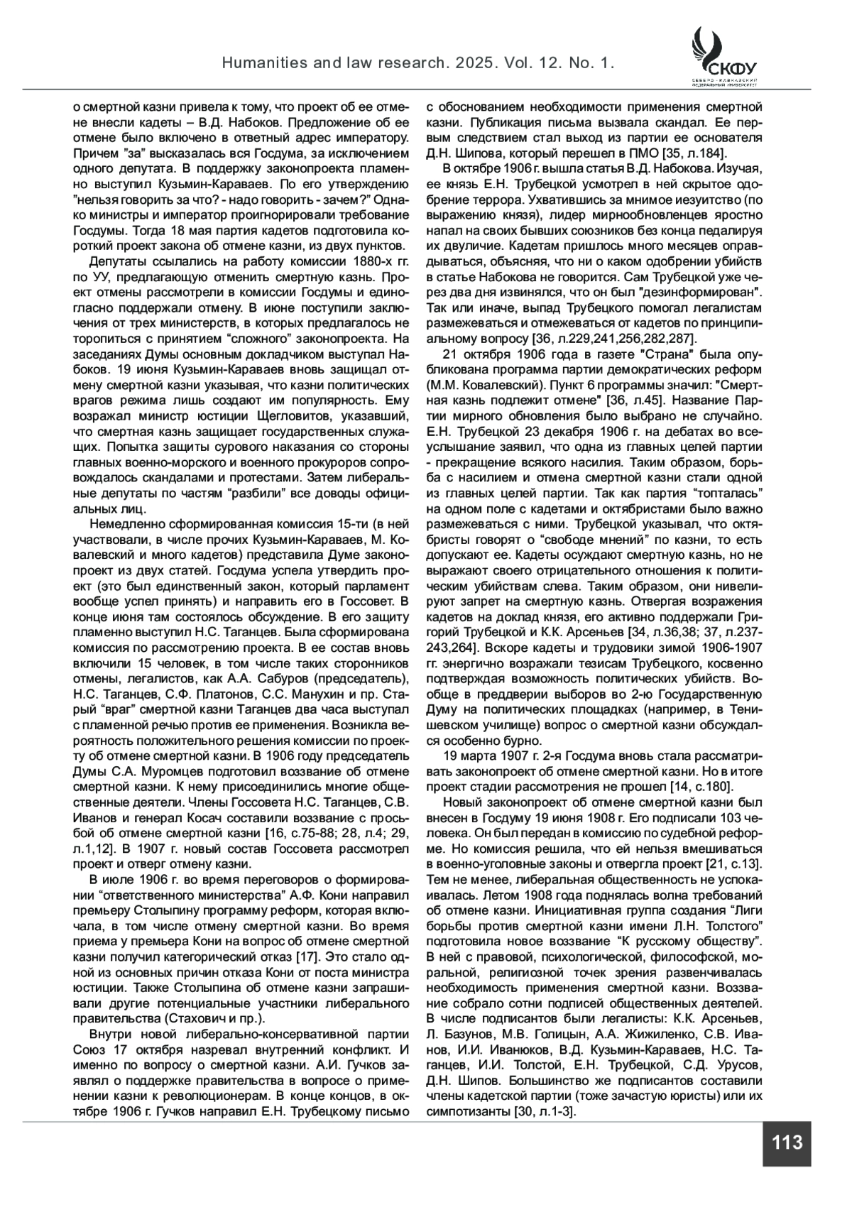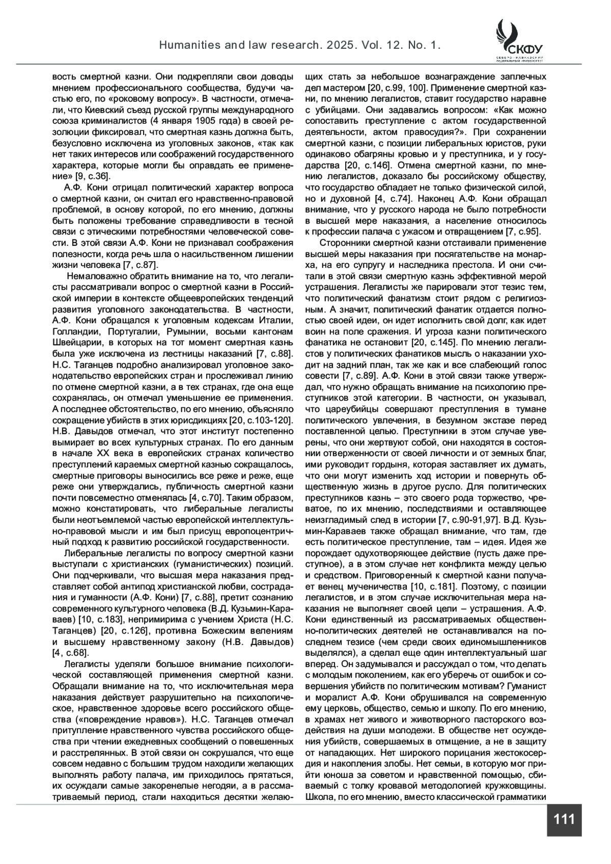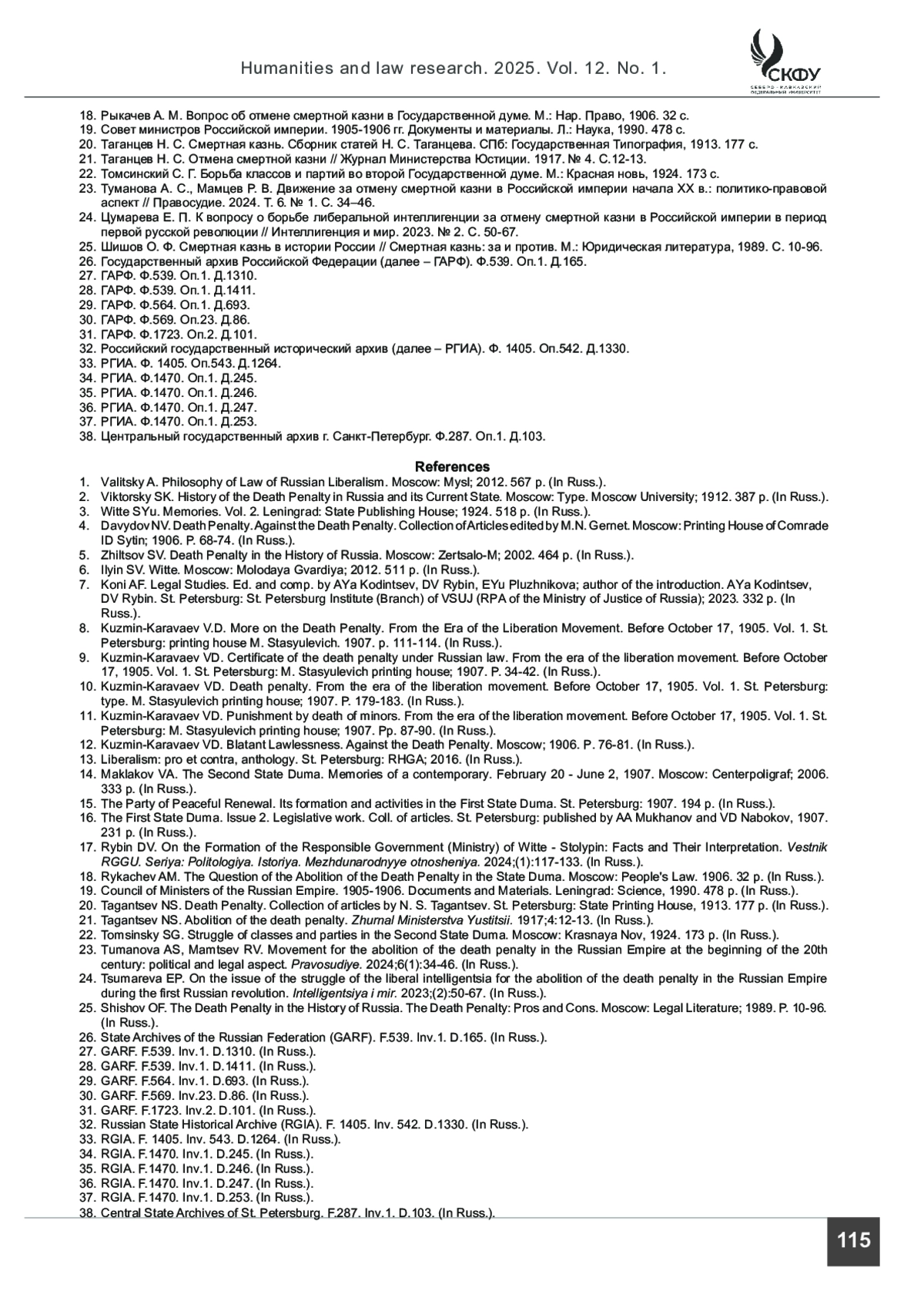 РЫБИН Д. В. ПРАВО НА ЖИЗНЬ И СМЕРТНАЯ КАЗНЬ В РОССИЙСКОЙ ИМПЕРИИ В ВОЗЗРЕНИЯХ ЛИБЕРАЛЬНЫХ ЛЕГАЛИСТОВ НА РУБЕЖЕ ХIХ – ХХ ВЕКОВ // ГУМАНИТАРНЫЕ И ЮРИДИЧЕСКИЕ ИССЛЕДОВАНИЯ. 2025. ТОМ 12, № 1