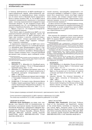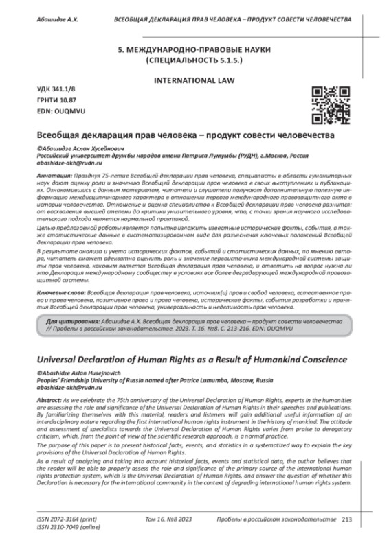 A.Kh. Abashidze. Universal Declaration of Human Rights as the greatest act in the history of mankind // Russian year-book of international law. 2008. - P. 209 - 214.