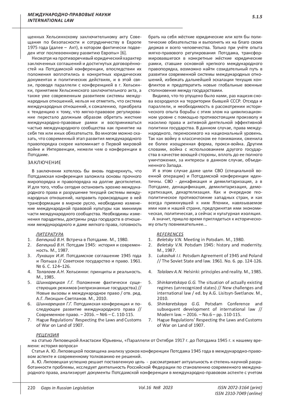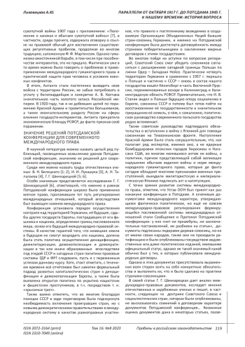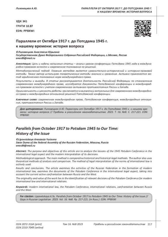 ЛИПОВЕЦКАЯ А. Ю. ПАРАЛЛЕЛИ ОТ ОКТЯБРЯ 1917 Г. ДО ПОТСДАМА 1945 Г. К НАШЕМУ ВРЕМЕНИ: ИСТОРИЯ ВОПРОСА // ПРОБЕЛЫ В РОССИЙСКОМ ЗАКОНОДАТЕЛЬСТВЕ. 2023. Т. 16 № 8 (36 СТ.)