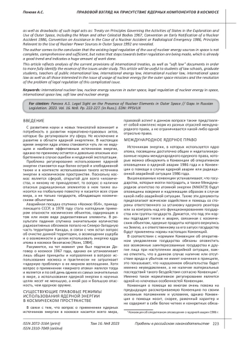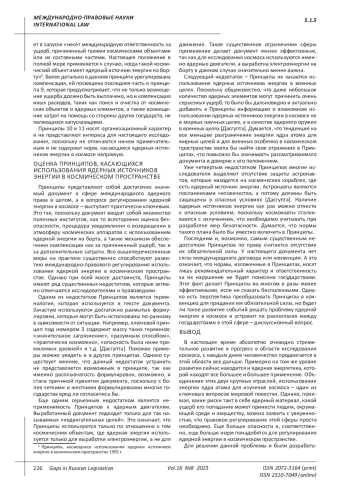 В данной статье исследуется правовое регулирование использования ядерной энергии в космическом пространстве, в частности, рассматривается вопрос использования ядерных источников энергии на космических объектах. Целью проведения такого исследования является анализ существующих норм международного права, регулирующих возможность применения ядерной энергии в космосе, а также выявление пробелов в таком регулировании. Кроме того, исследование направлено на более детальное изучение имеющихся норм «мягкого права», в частности, рассмотрены Принципы, касающиеся использования ядерных источников энергии в космическом пространстве 1992 года, которые являются практически единственным регулятором использования ядерных источников энергии в космическом пространстве. В статье приведён анализ основополагающих конвенций в области регулирования ядерной энергии в контексте ее применения в космосе, в основе которого лежит мнение компетентных исследователей международного ядерного права и международного космического права. Автор настоящей статьи проводит подробный анализ нормативно-правовой базы в области применения энергии ядра атома в космосе, а именно с помощью сравнительно-правового метода выявлены основополагающие нормы, идеи и достоинства, а также недостатки таких нормативно-правовых актов, как: Договор о принципах деятельности государств по исследованию и использованию космического пространства, включая Луну и другие небесные тела 1967 г., Конвенция об оперативном оповещении о ядерной аварии 1986 г., Конвенция о помощи в случае ядерной или радиационной аварийной ситуации 1986 г., Принципы, касающиеся использования ядерных источников энергии в космическом пространстве 1992 г. Автор приходит к выводу, что имеющееся нормативно-правовое регулирование использования ядерных источников энергии в космосе не является полным, всеобъемлющим и достаточным, однако отмечает, что шаги в направлении более качественного регулирования делаются, что уже является хорошей тенденцией и свидетельствует об огромном объеме проделанной работы. В данной статье отражён собственный анализ актуальных положений международных договоров, а также документов «мягкого права» для более полного выявления сути исследуемых вопросов.