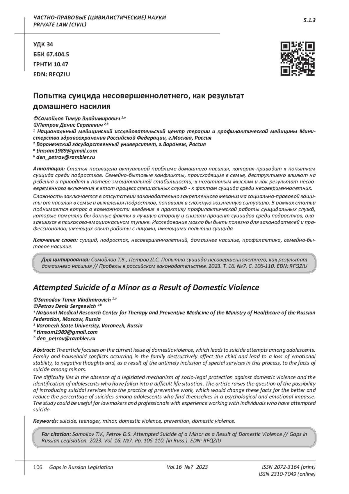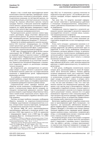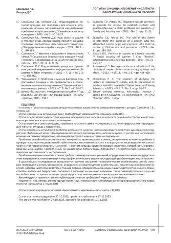 6. Самойлов Т.В., Петров Д.С. Роль семьи в охране интересов лица, совершившего попытку суицида: правовые последствия материального характера. // Государственная служба и кадры. - 2023. - № 3. - С. 180-183. EDN: QFUMPO
