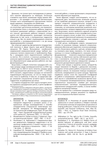 4. Самойлов Т.В., Петров Д.С. Защита детей от насилия и предотвращение суицидов // Пробелы в российском законодательстве. - 2023. - Т. 16. - № 6. - С. 86-90. EDN: REBWTF