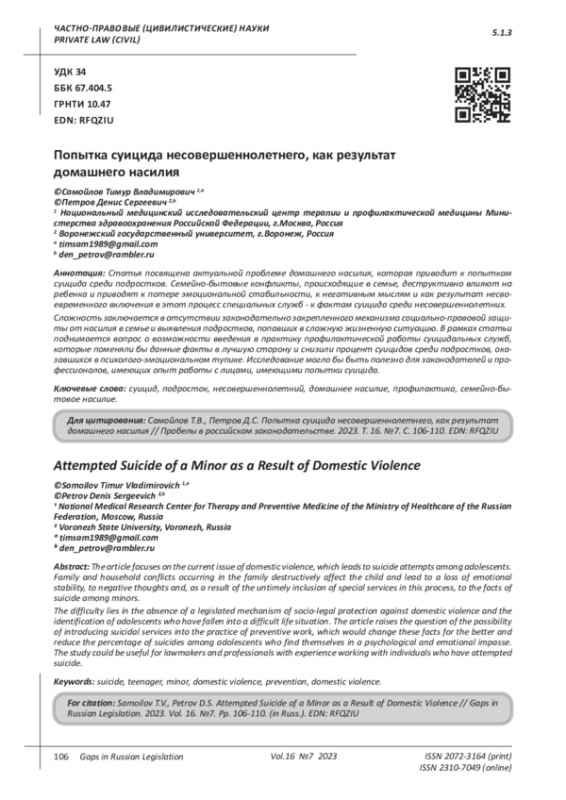 Samoilov T.V., Petrov D.S. Protection of children from violence and suicide prevention // Gaps in Russian legislation. - 2023. - Vol. 16. - No. 6. - pp. 86-90. EDN: REBWTF