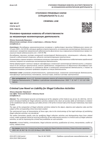 Исследованы криминологические основания и предыстория принятия Федерального закона от 10 июля 2023 г. № 323-ФЗ, которым введена ответственность за незаконную коллекторскую деятельность, связанную с возвратом просроченной задолженности физических лиц в нарушение установленных правил погашения такой задолженности (ст. 1724 УК РФ). Исследованы признаки состава незаконной коллекторской деятельности, относящиеся к объекту, объективной и субъективной сторонам, субъекту соответствующего преступления. Рассмотрены спорные вопросы толкования указанных признаков, обусловленные недостатками юридической техники запрета на незаконную коллекторскую деятельность. Автор формулирует частные правила квалификации незаконной коллекторской деятельности и отграничения ее от смежных преступлений, вносит предложения, направленные на обеспечение единообразия правоприменительной практики по уголовным делам о незаконной коллекторской деятельности, а также не совершенствование уголовно-правового запрета на такую деятельность.
