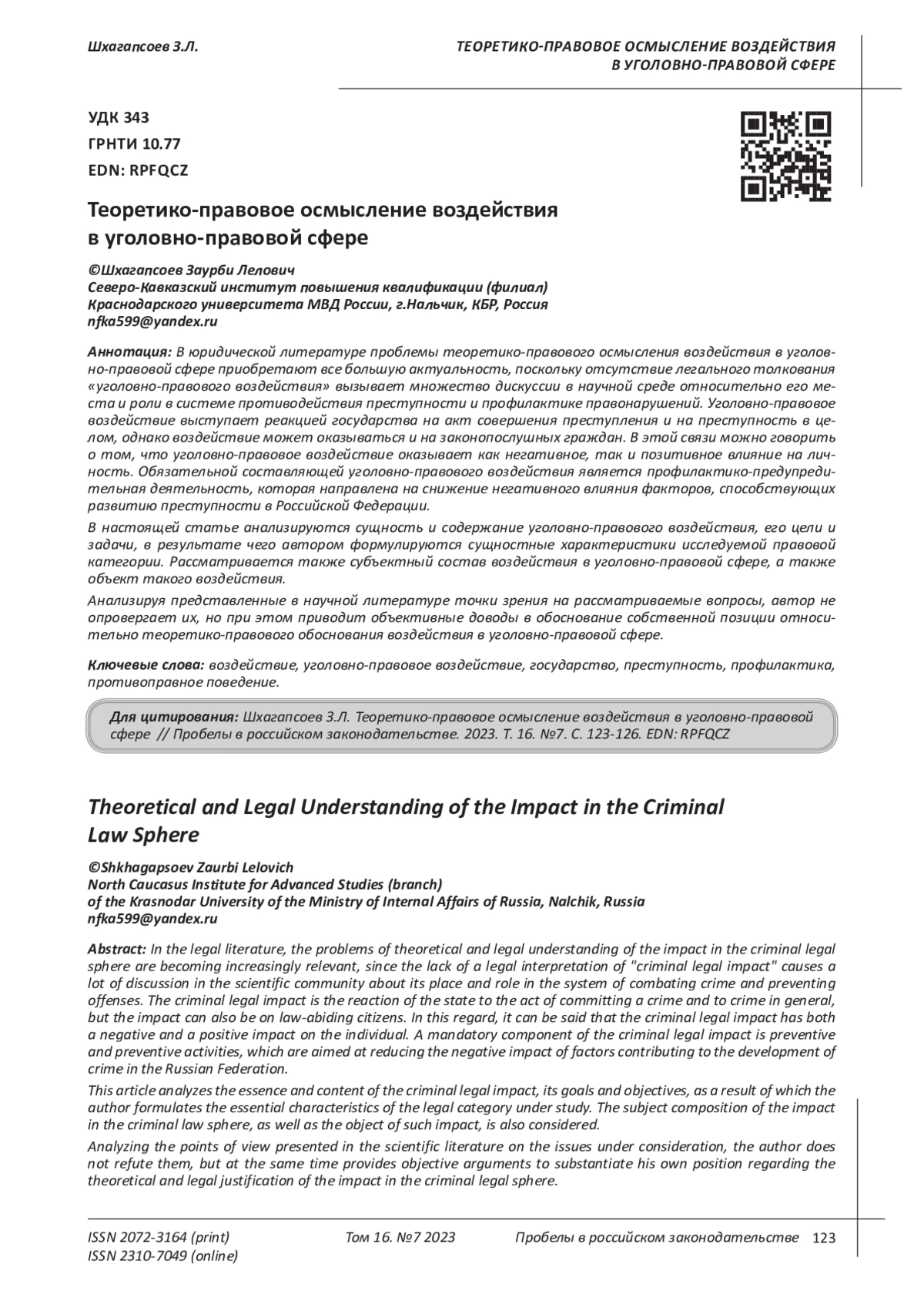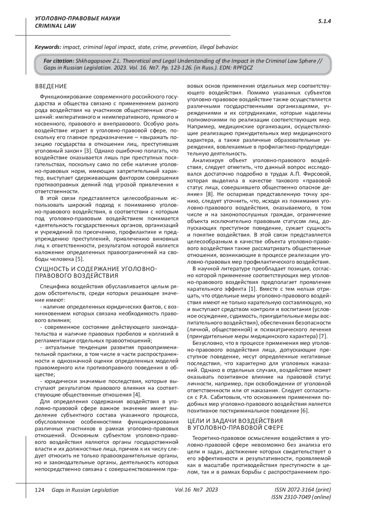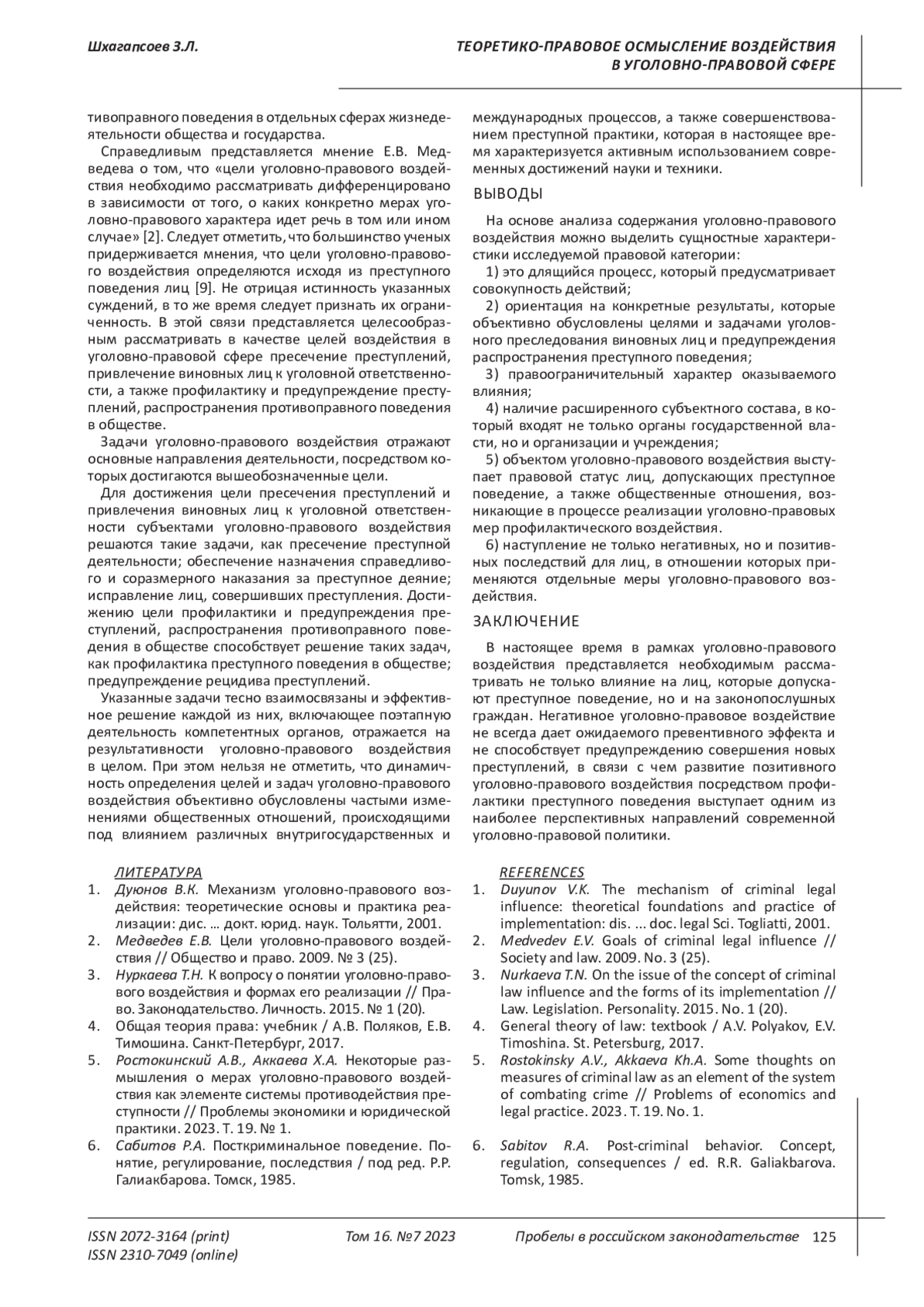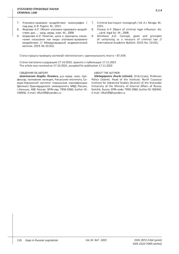 5. Ростокинский А.В., Аккаева Х.А. Некоторые размышления о мерах уголовно-правового воздействия как элементе системы противодействия преступности // Проблемы экономики и юридической практики. 2023. Т. 19. № 1. EDN: ZQDEPR