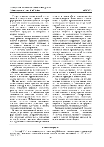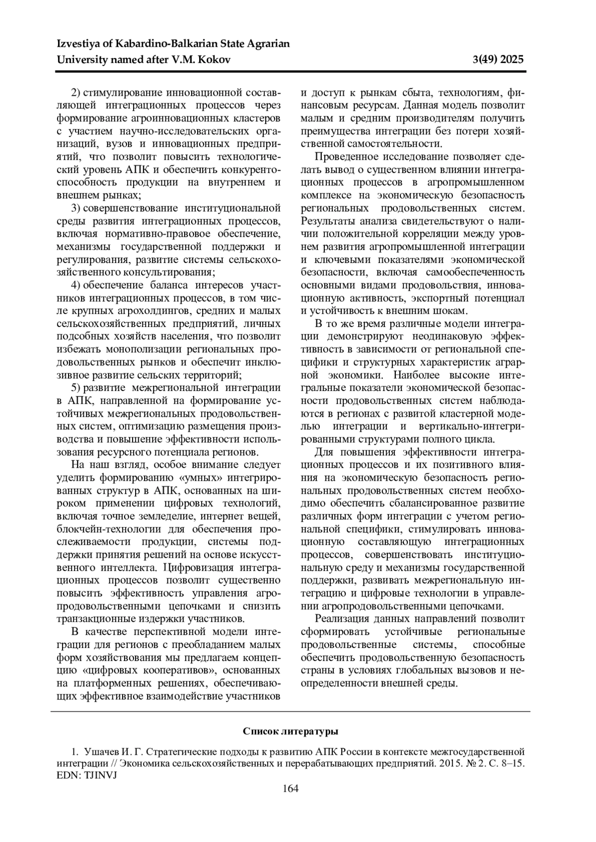 1. Ушачев И. Г. Стратегические подходы к развитию АПК России в контексте межгосударственной интеграции // Экономика сельскохозяйственных и перерабатывающих предприятий. 2015. № 2. С. 8-15. EDN: TJINVJ
