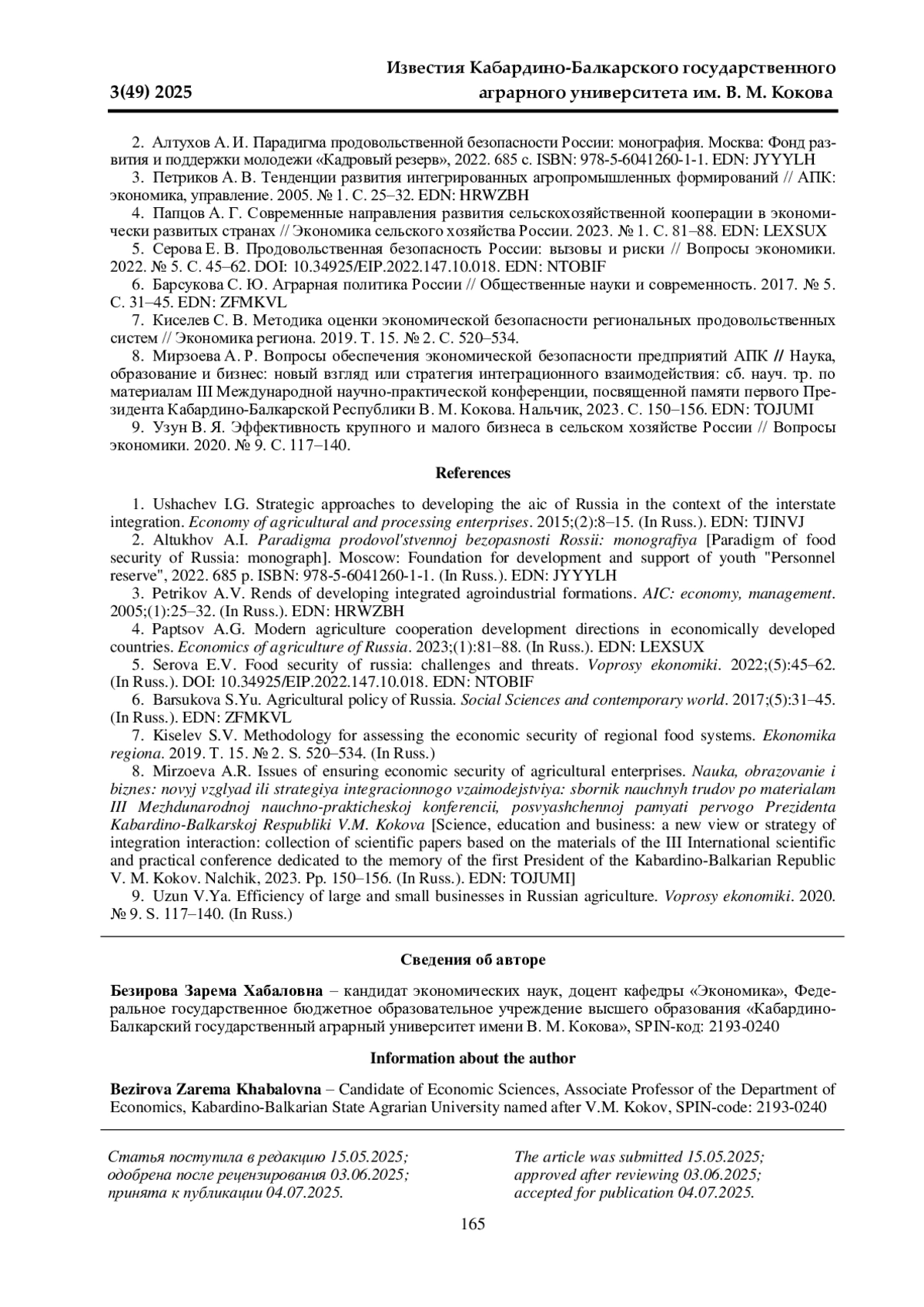 8. Мирзоева А. Р. Вопросы обеспечения экономической безопасности предприятий АПК // Наука, образование и бизнес: новый взгляд или стратегия интеграционного взаимодействия: сб. науч. тр. по материалам III Международной научно-практической конференции, посвященной памяти первого Президента Кабардино-Балкарской Республики В. М. Кокова. Нальчик, 2023. С. 150-156. EDN: TOJUMI