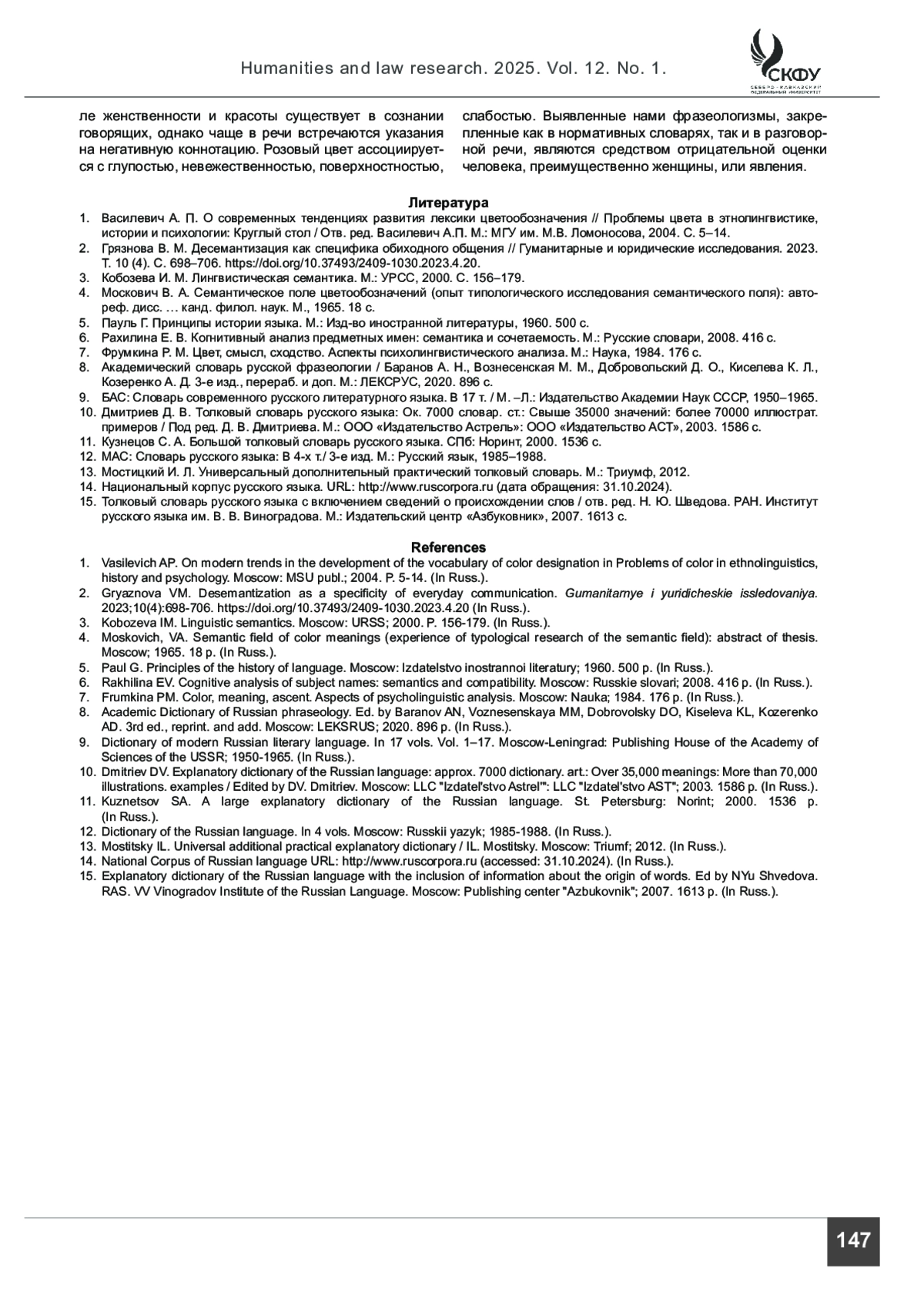 2. Грязнова В. М. Десемантизация как специфика обиходного общения // Гуманитарные и юридические исследования. 2023. Т. 10 (4). С. 698-706. https://doi.org/10.37493/2409-1030.2023.4.20.